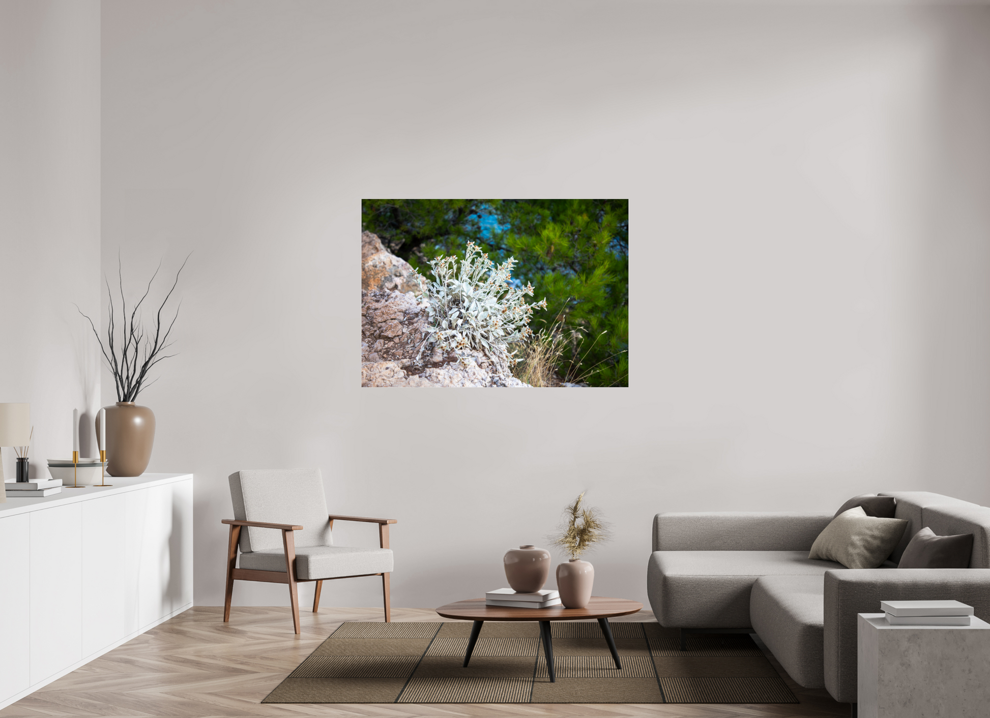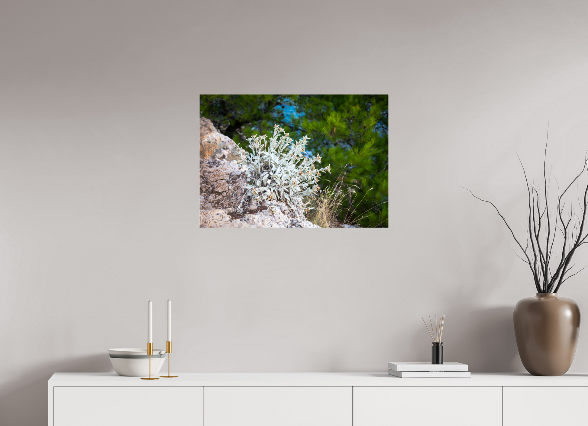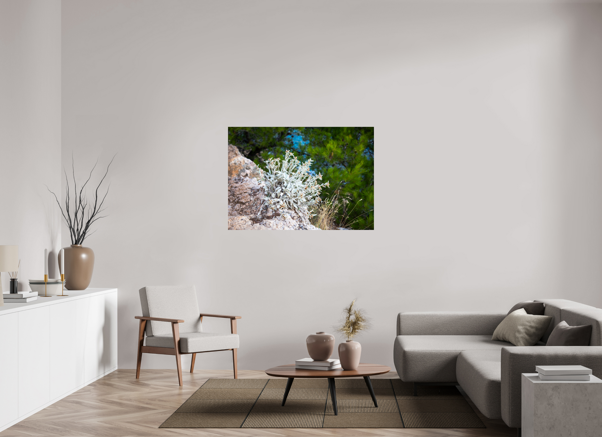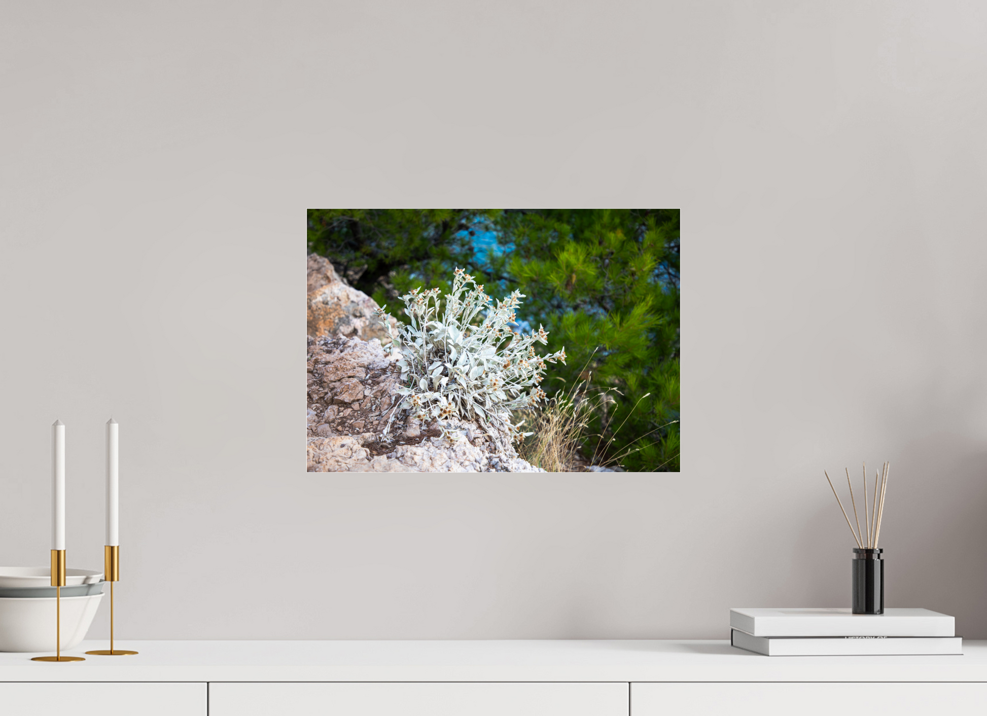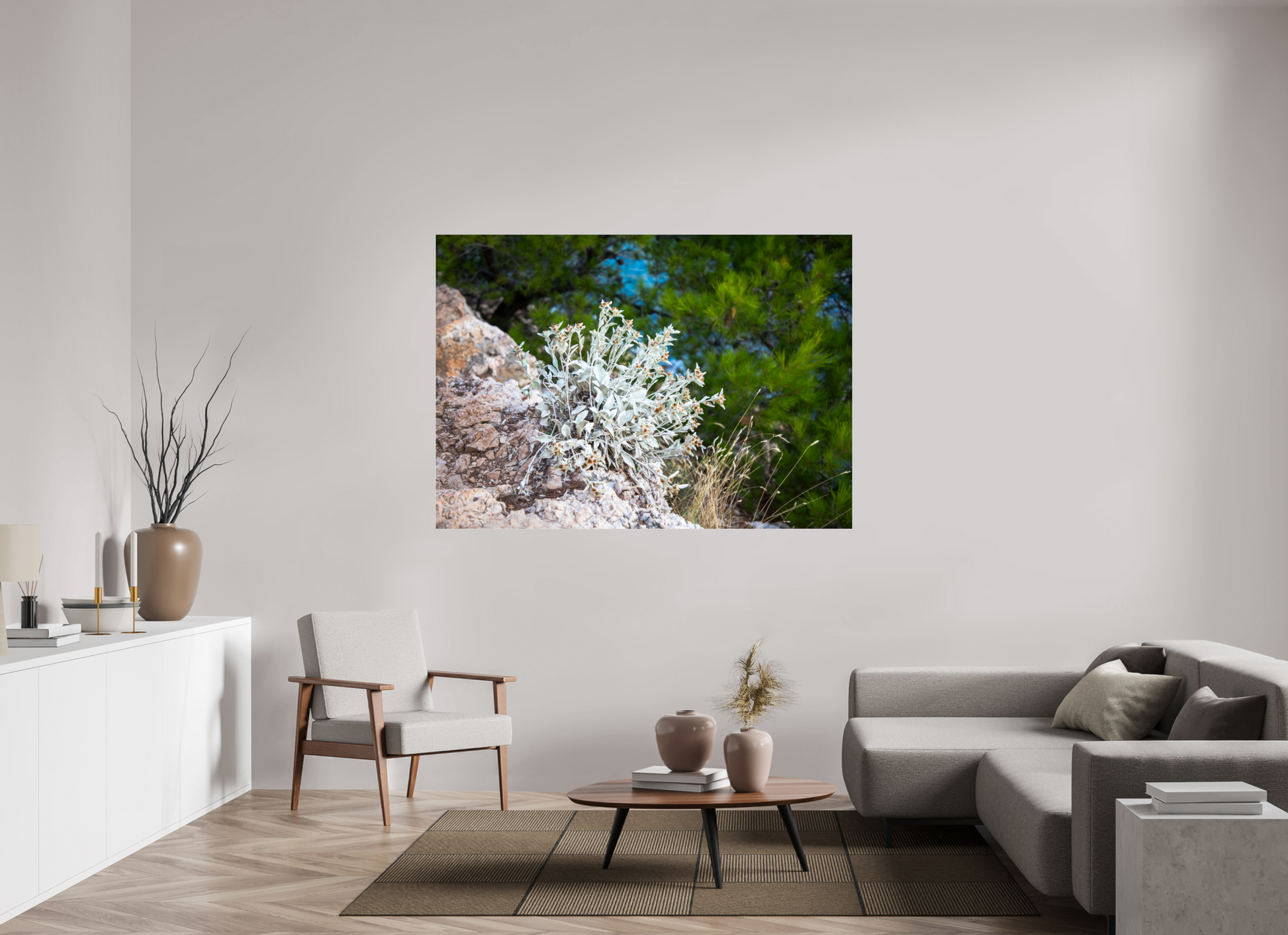 "Flower" – ein Fine Art Print, der die beeindruckende Widerstandsfähigkeit der Natur zeigt. Im Zentrum des Bildes steht eine Pflanze mit silbrig-weißen Blättern, die sich an einem felsigen Abhang festgeklammert hat. Ihre Blätter, zart und filigran, scheinen dennoch der Kraft des Windes und der Sonne zu trotzen. Die Pflanze wächst inmitten von trockenem Gras und dunklen Kiefernnadeln, ein Kontrast, der ihre einzigartige Schönheit noch stärker hervorhebt. Im Hintergrund schimmert ein Stück türkisfarbenes Meer, das die Weite und die Kraft der Natur unterstreicht. Das Bild ist eine Hommage an die Lebenskraft und die Anpassungsfähigkeit der Natur, ein stiller Zeuge für die Schönheit, die selbst unter rauen Bedingungen gedeiht.
