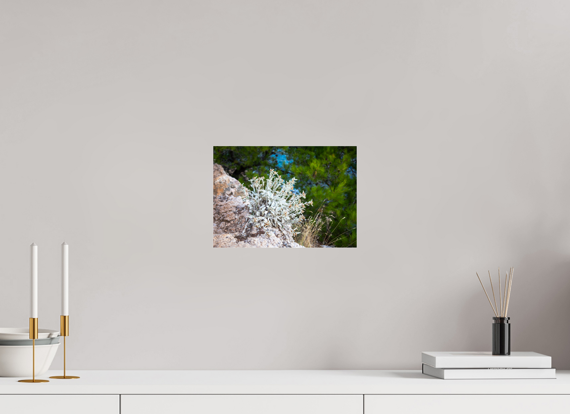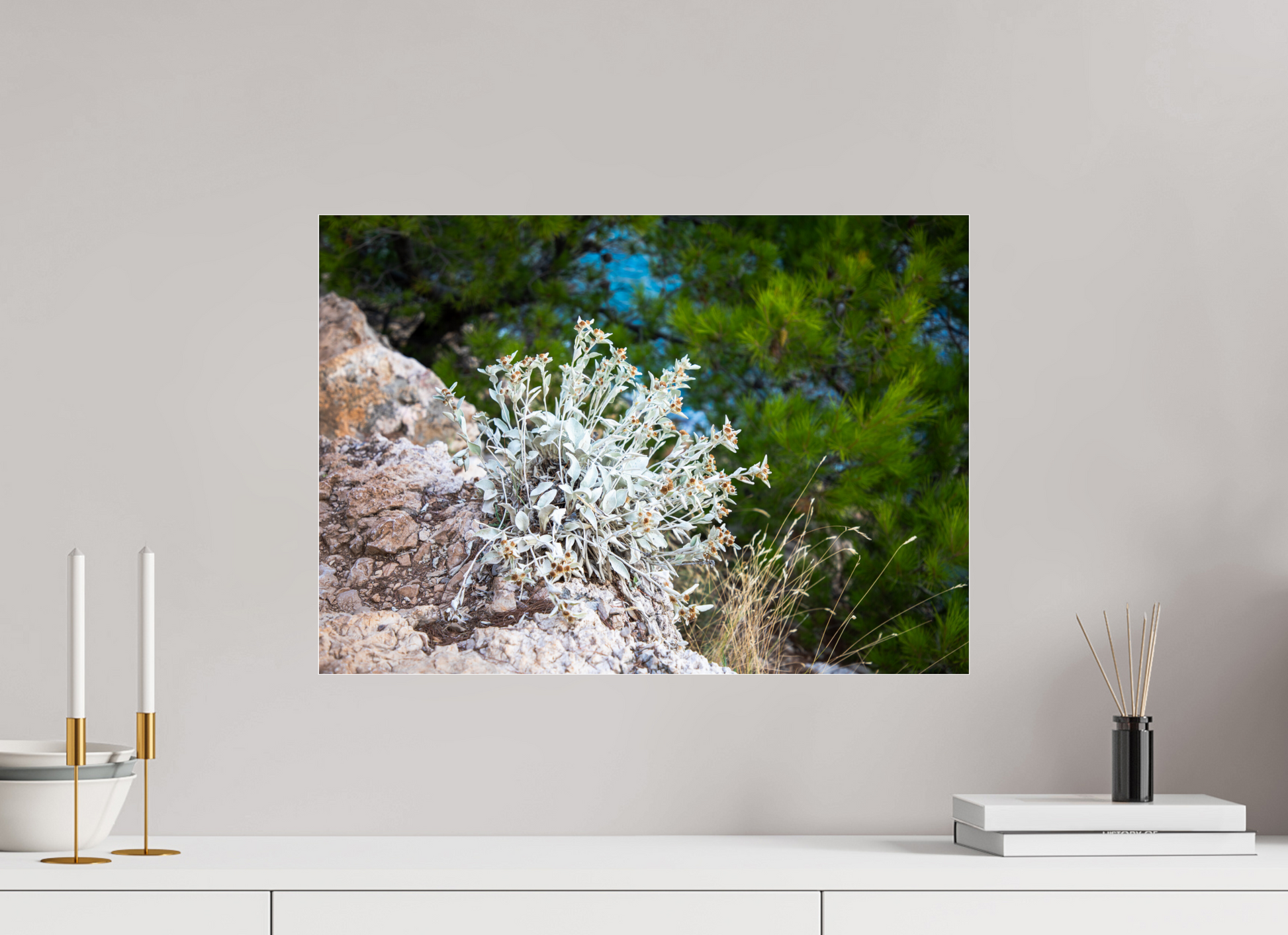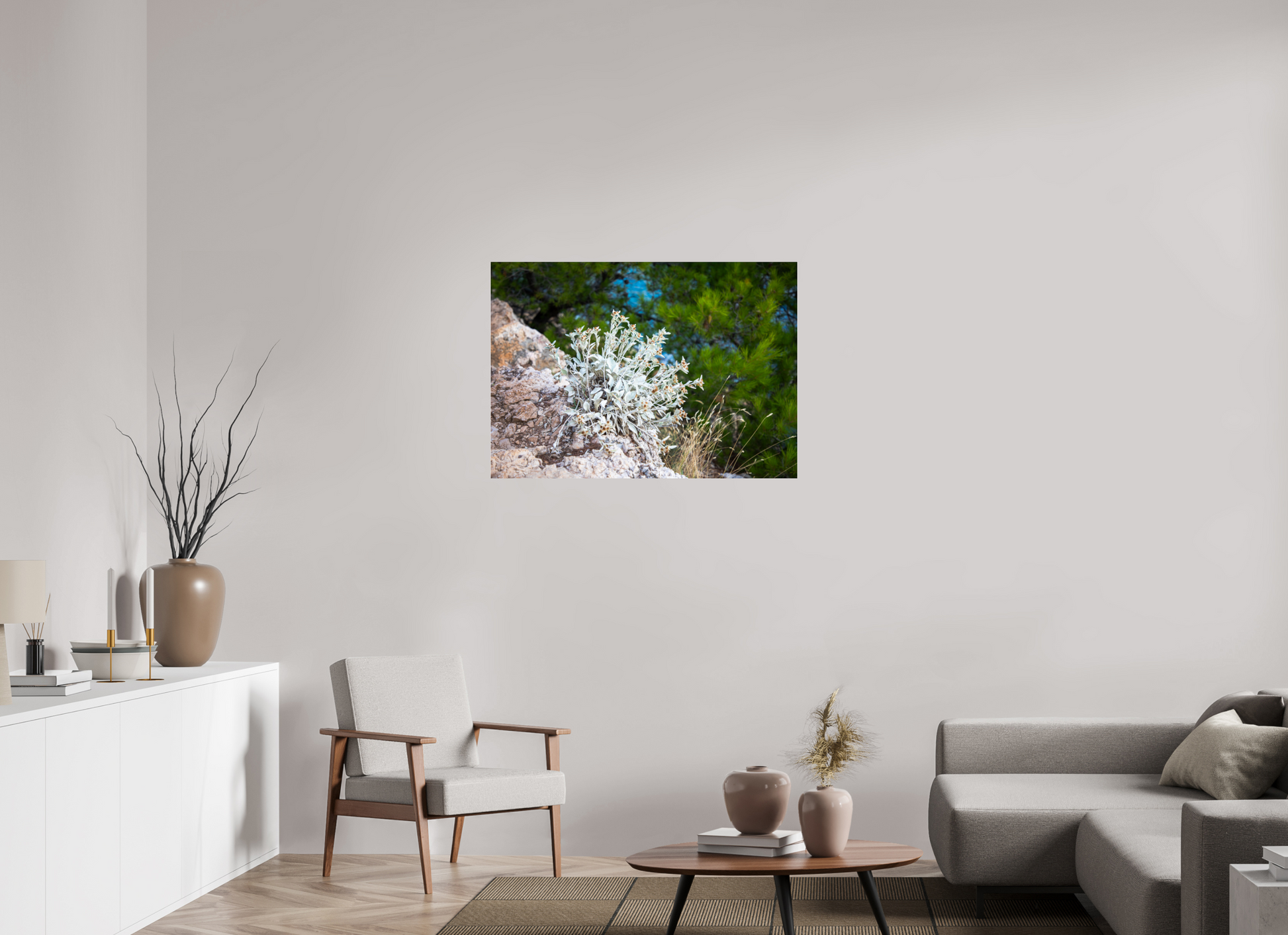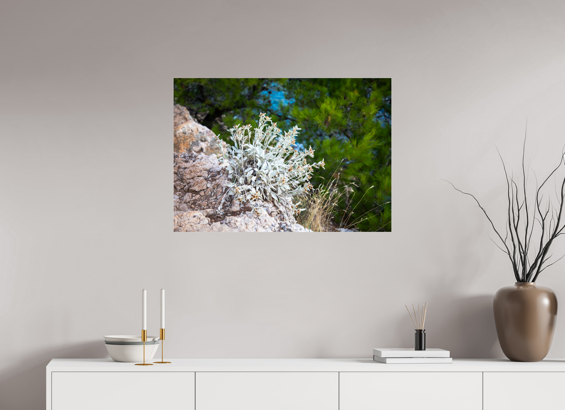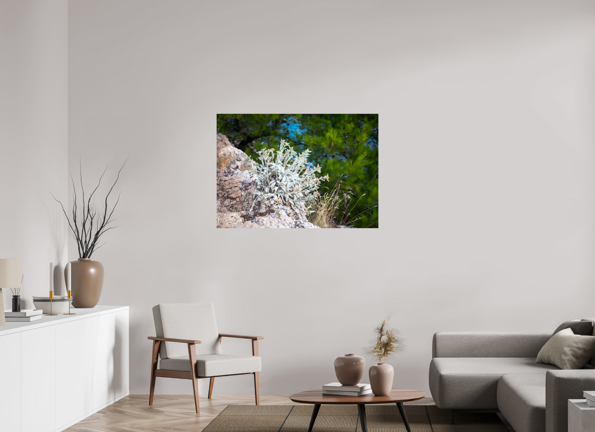 "Flower" – ein Fine Art Print, der die beeindruckende Widerstandsfähigkeit der Natur zeigt. Im Zentrum des Bildes steht eine Pflanze mit silbrig-weißen Blättern, die sich an einem felsigen Abhang festgeklammert hat. Ihre Blätter, zart und filigran, scheinen dennoch der Kraft des Windes und der Sonne zu trotzen. Die Pflanze wächst inmitten von trockenem Gras und dunklen Kiefernnadeln, ein Kontrast, der ihre einzigartige Schönheit noch stärker hervorhebt. Im Hintergrund schimmert ein Stück türkisfarbenes Meer, das die Weite und die Kraft der Natur unterstreicht. Das Bild ist eine Hommage an die Lebenskraft und die Anpassungsfähigkeit der Natur, ein stiller Zeuge für die Schönheit, die selbst unter rauen Bedingungen gedeiht.