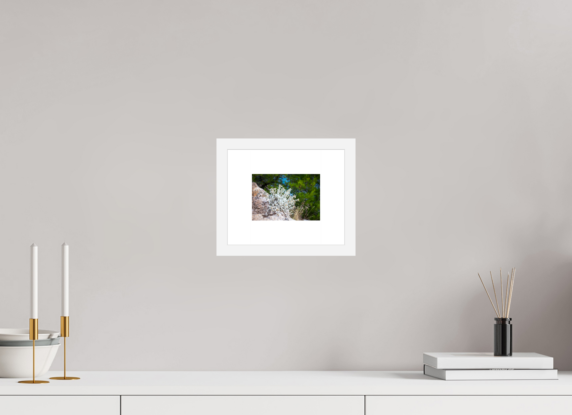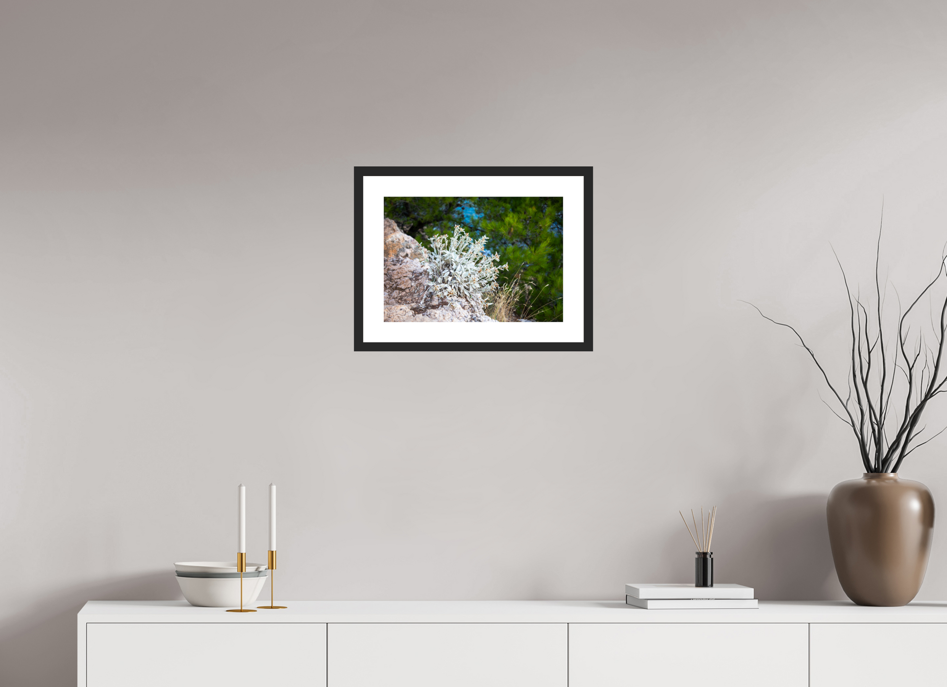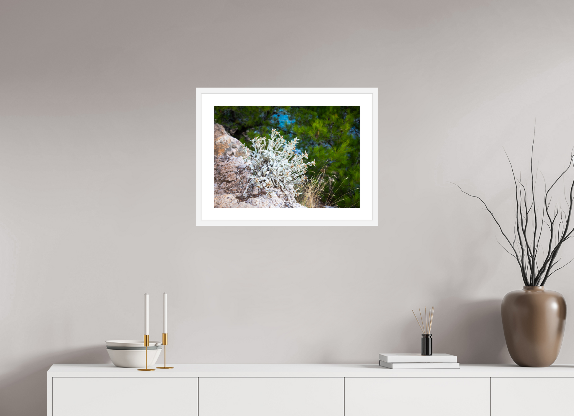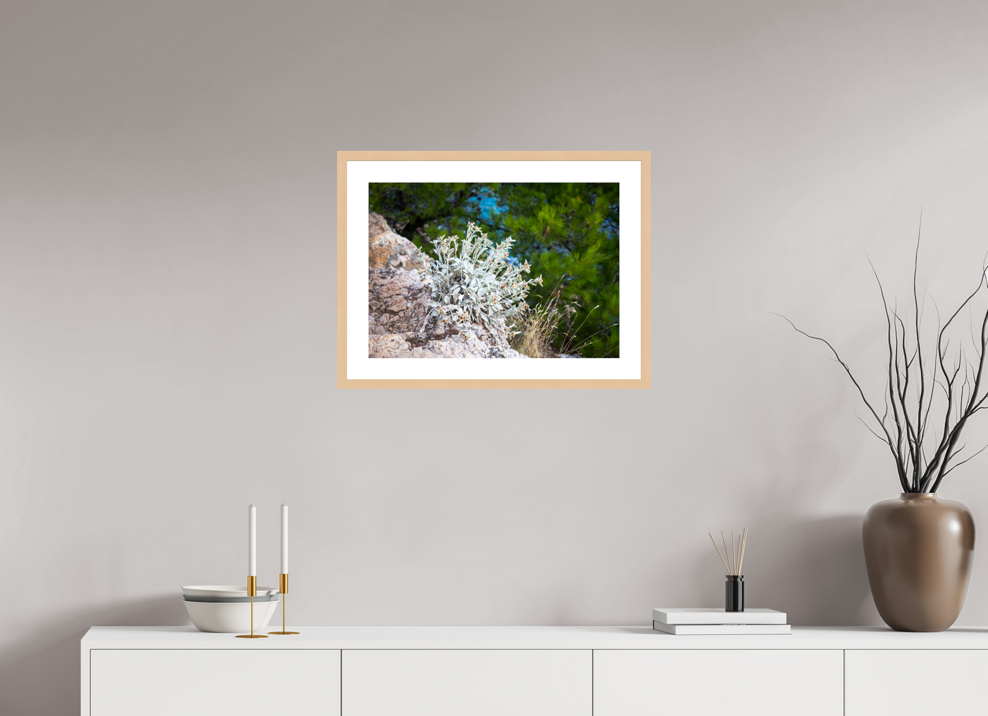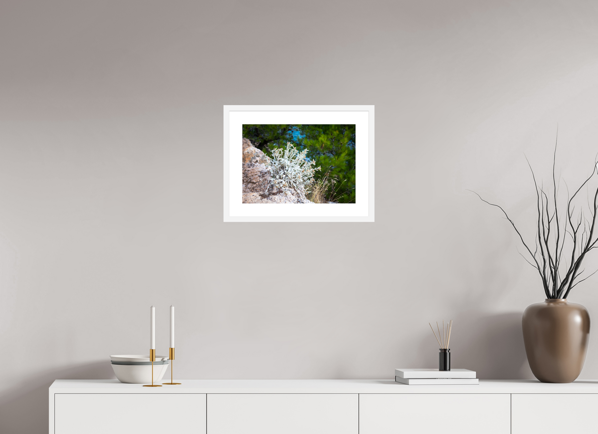 "Flower" – ein Fine Art Print, der die beeindruckende Widerstandsfähigkeit der Natur zeigt. Im Zentrum des Bildes steht eine Pflanze mit silbrig-weißen Blättern, die sich an einem felsigen Abhang festgeklammert hat. Ihre Blätter, zart und filigran, scheinen dennoch der Kraft des Windes und der Sonne zu trotzen. Die Pflanze wächst inmitten von trockenem Gras und dunklen Kiefernnadeln, ein Kontrast, der ihre einzigartige Schönheit noch stärker hervorhebt. Im Hintergrund schimmert ein Stück türkisfarbenes Meer, das die Weite und die Kraft der Natur unterstreicht. Das Bild ist eine Hommage an die Lebenskraft und die Anpassungsfähigkeit der Natur, ein stiller Zeuge für die Schönheit, die selbst unter rauen Bedingungen gedeiht.