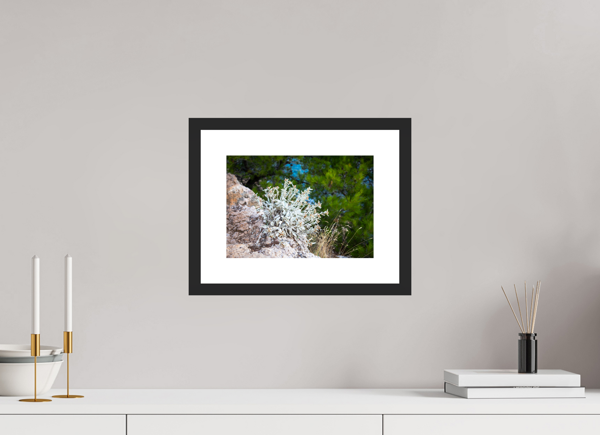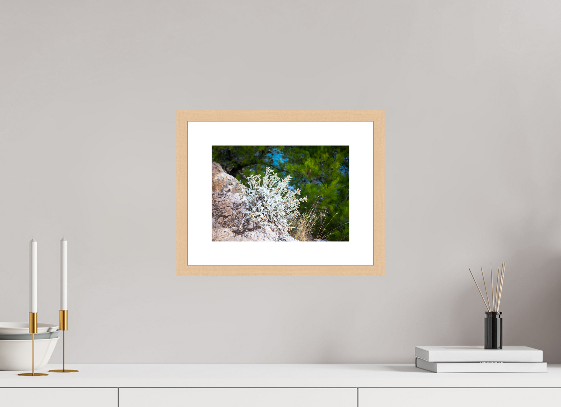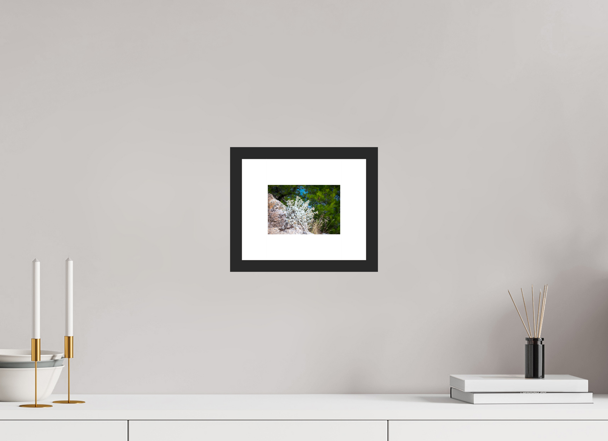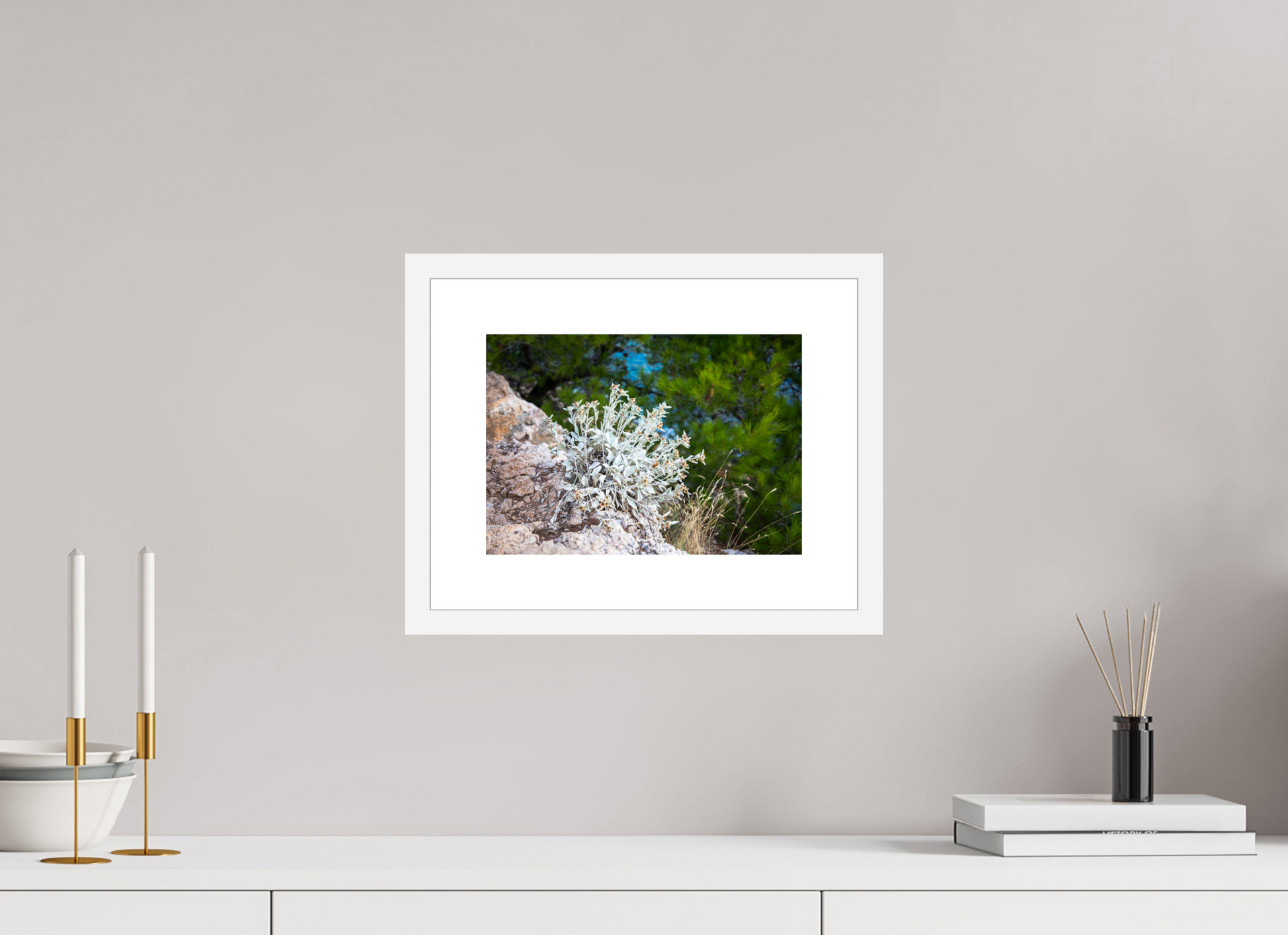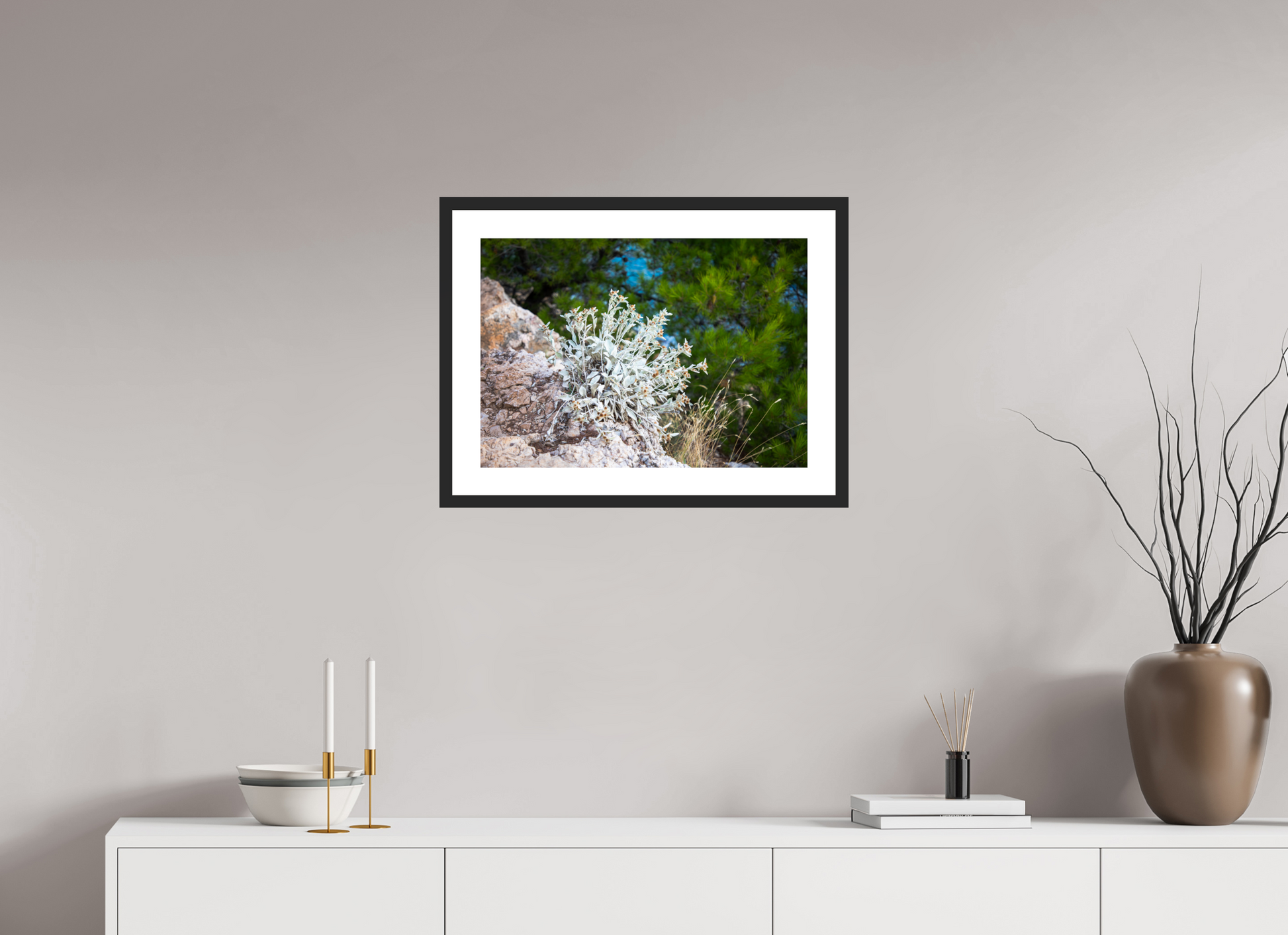 "Flower" – ein Fine Art Print, der die beeindruckende Widerstandsfähigkeit der Natur zeigt. Im Zentrum des Bildes steht eine Pflanze mit silbrig-weißen Blättern, die sich an einem felsigen Abhang festgeklammert hat. Ihre Blätter, zart und filigran, scheinen dennoch der Kraft des Windes und der Sonne zu trotzen. Die Pflanze wächst inmitten von trockenem Gras und dunklen Kiefernnadeln, ein Kontrast, der ihre einzigartige Schönheit noch stärker hervorhebt. Im Hintergrund schimmert ein Stück türkisfarbenes Meer, das die Weite und die Kraft der Natur unterstreicht. Das Bild ist eine Hommage an die Lebenskraft und die Anpassungsfähigkeit der Natur, ein stiller Zeuge für die Schönheit, die selbst unter rauen Bedingungen gedeiht.