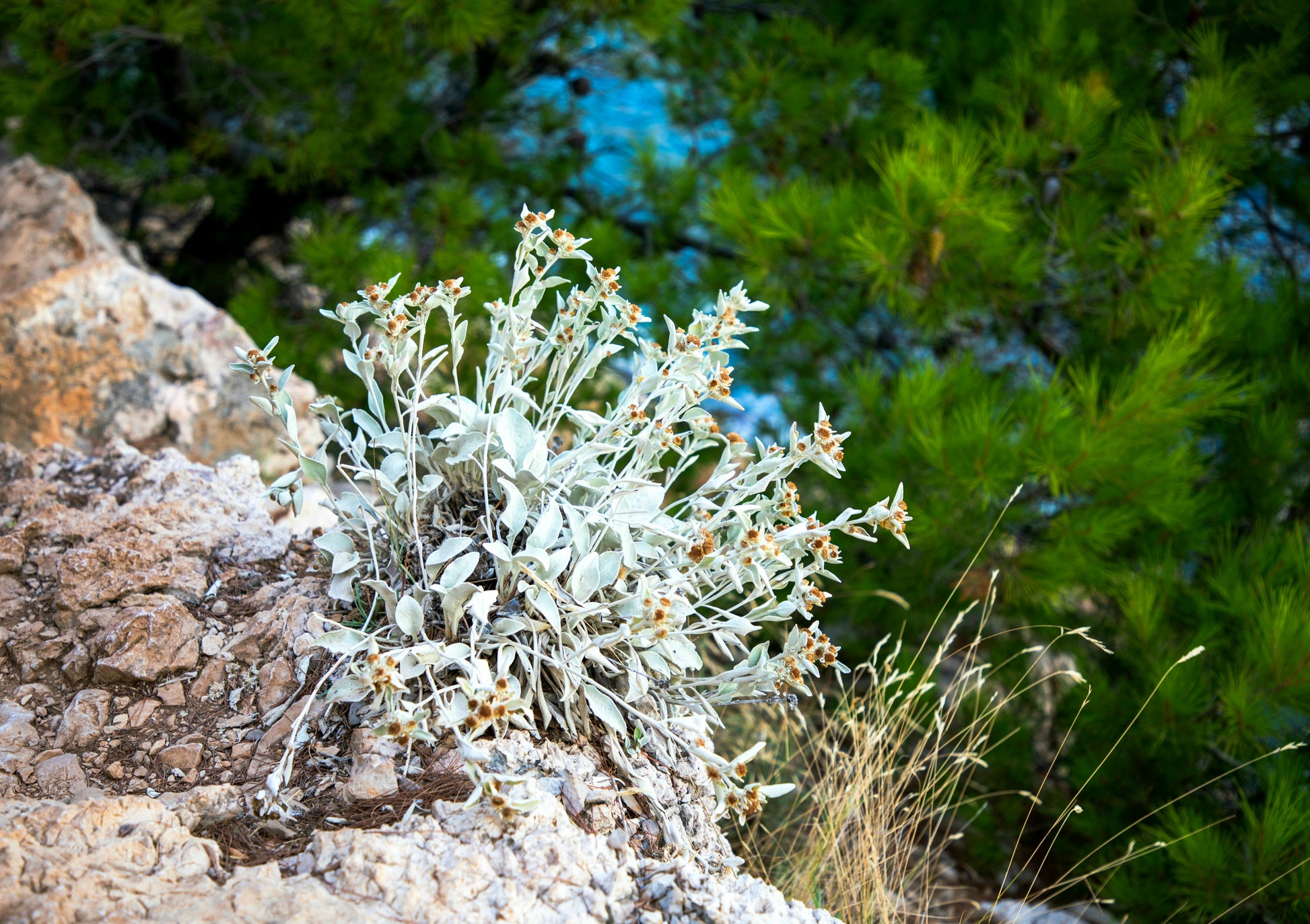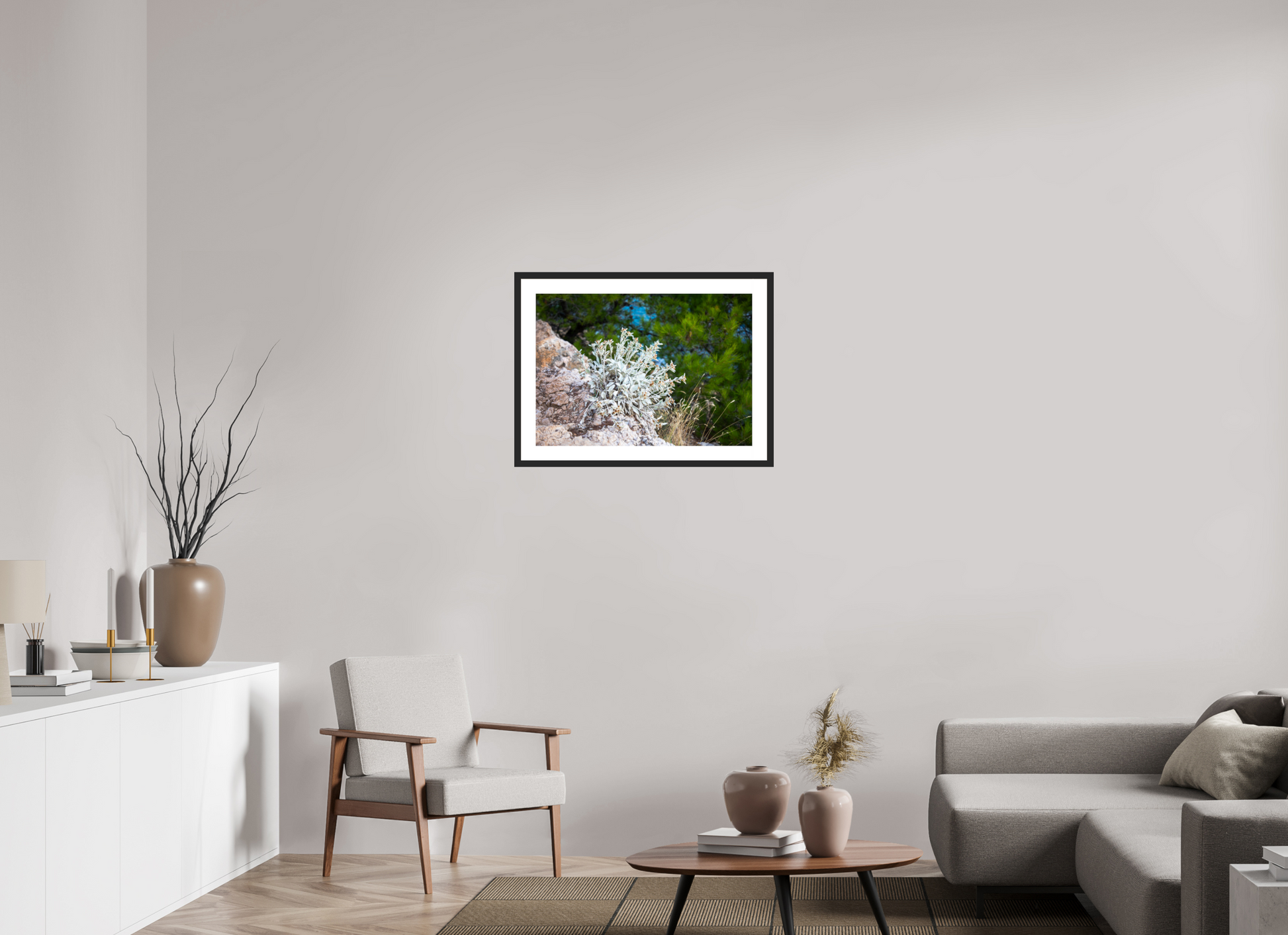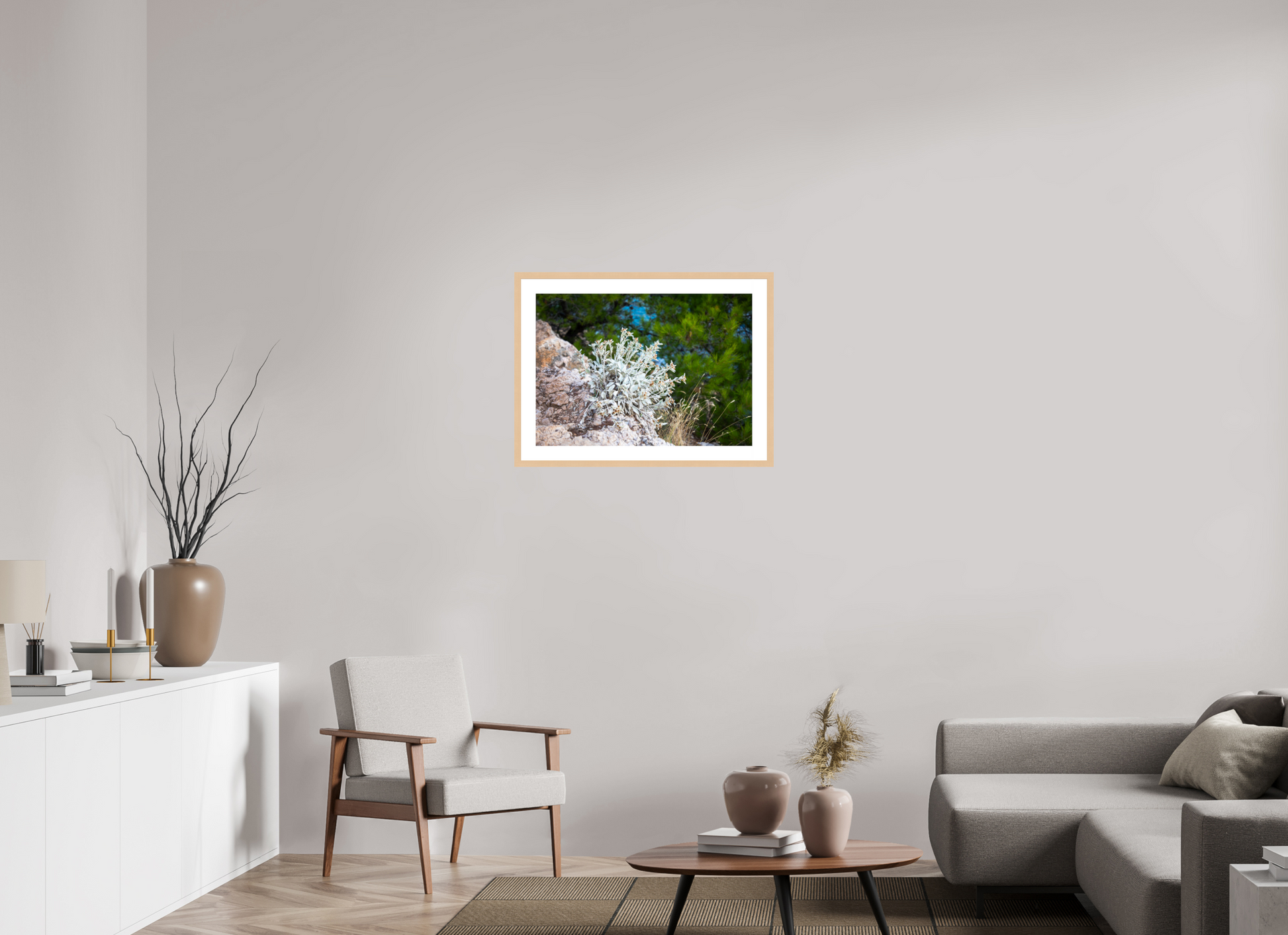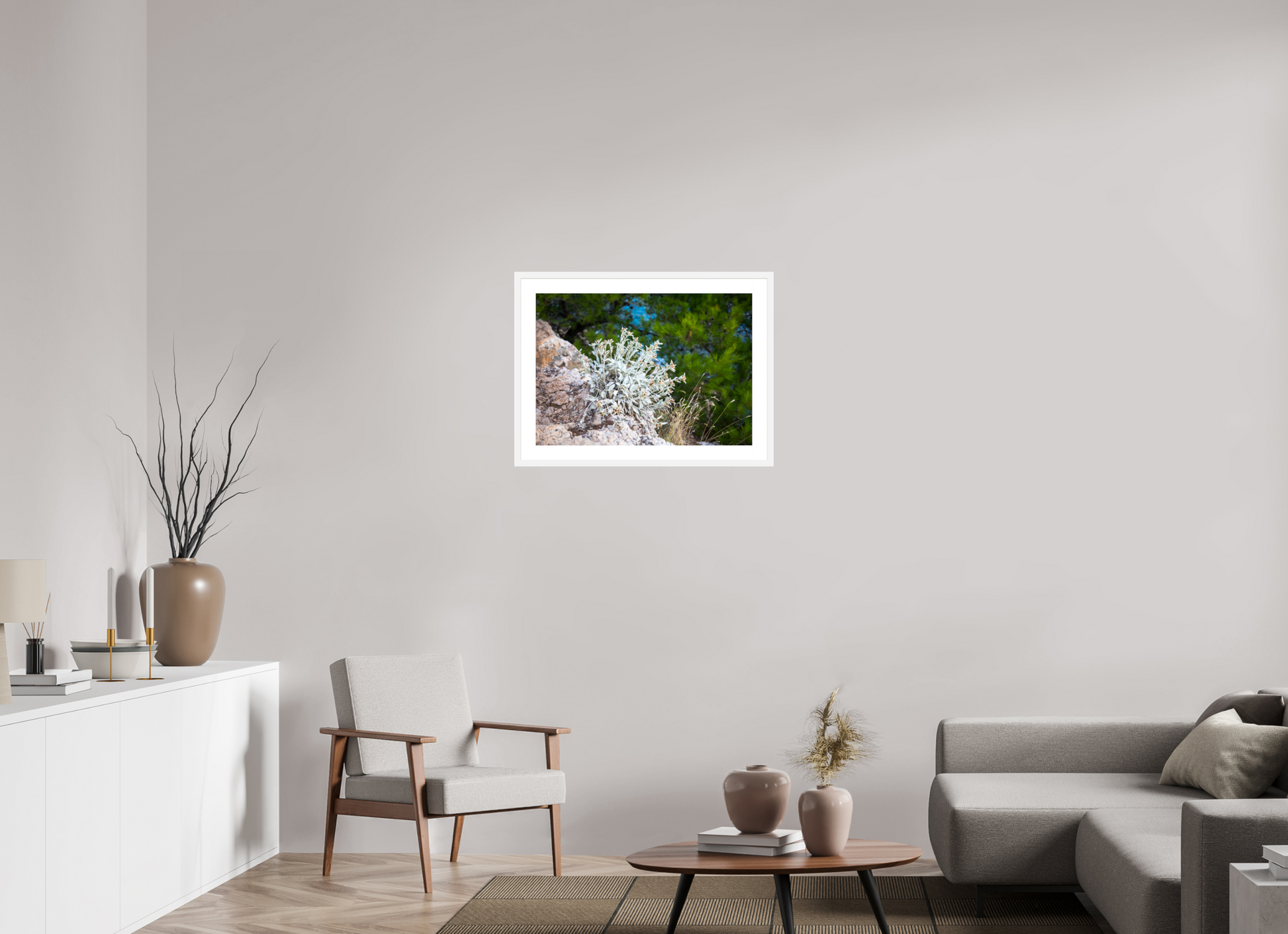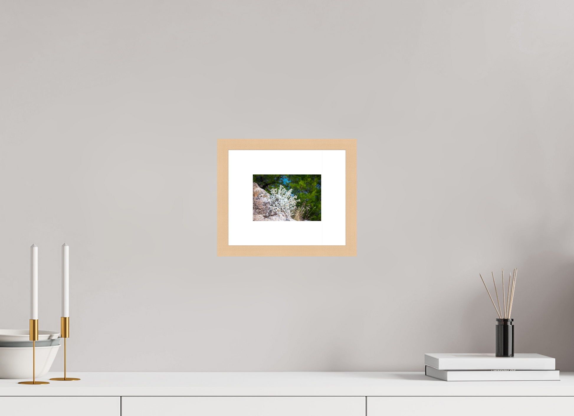 "Flower" – ein Fine Art Print, der die beeindruckende Widerstandsfähigkeit der Natur zeigt. Im Zentrum des Bildes steht eine Pflanze mit silbrig-weißen Blättern, die sich an einem felsigen Abhang festgeklammert hat. Ihre Blätter, zart und filigran, scheinen dennoch der Kraft des Windes und der Sonne zu trotzen. Die Pflanze wächst inmitten von trockenem Gras und dunklen Kiefernnadeln, ein Kontrast, der ihre einzigartige Schönheit noch stärker hervorhebt. Im Hintergrund schimmert ein Stück türkisfarbenes Meer, das die Weite und die Kraft der Natur unterstreicht. Das Bild ist eine Hommage an die Lebenskraft und die Anpassungsfähigkeit der Natur, ein stiller Zeuge für die Schönheit, die selbst unter rauen Bedingungen gedeiht.