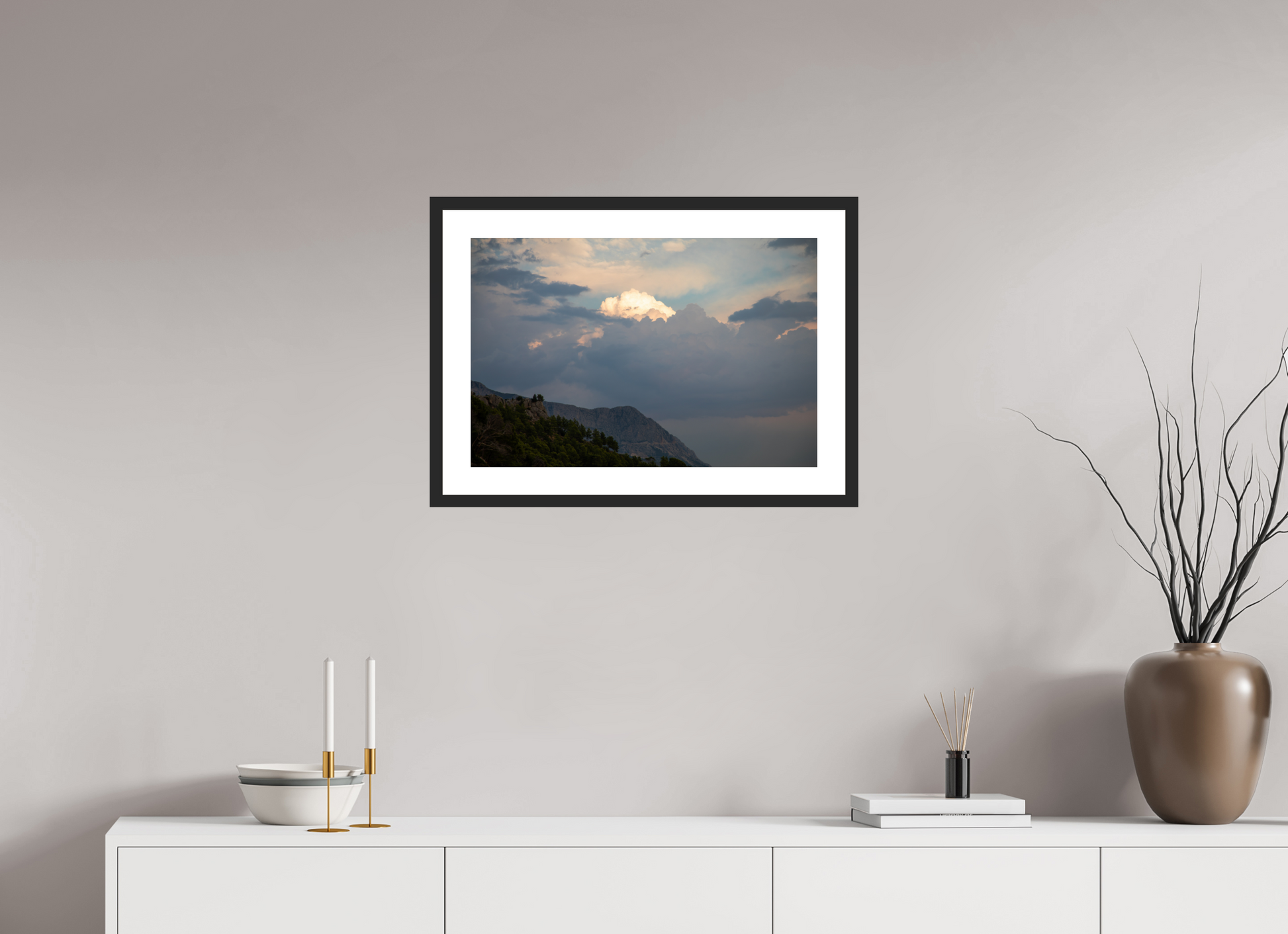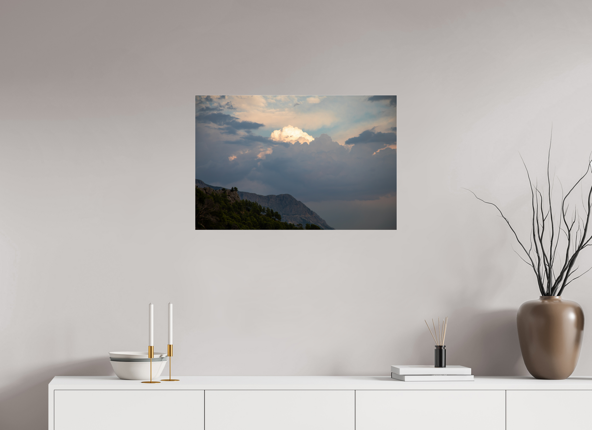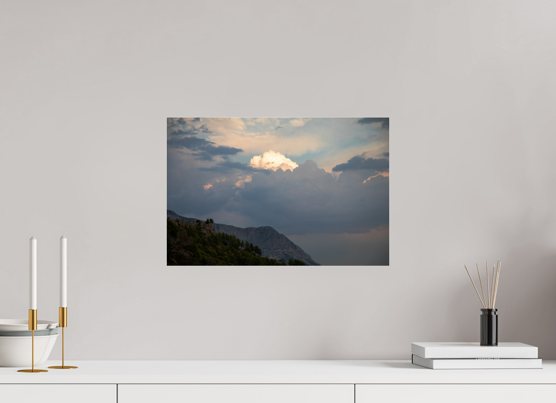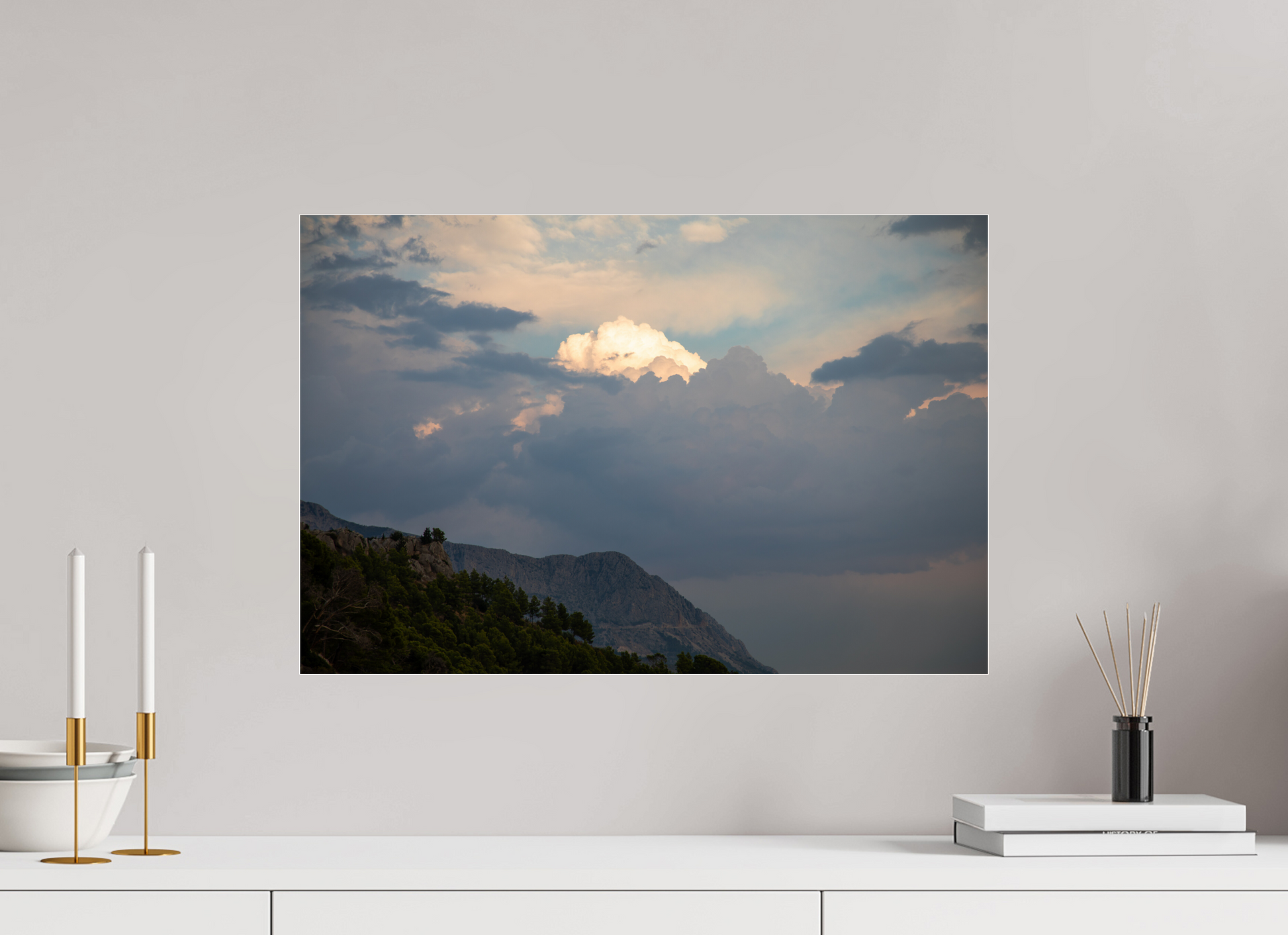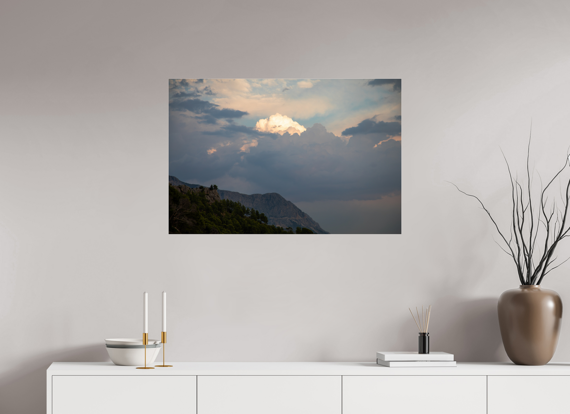 "Clouds" – ein Fine Art Print, der die ungezügelte Schönheit eines dramatischen Himmels festhält. Dunkle, tiefgraue Wolken türmen sich auf, ihre Masse und Dichte erzeugen ein Gefühl von Kraft und Urgewalt. Doch mitten in diesem Schauspiel der Natur bricht das Licht durch – ein strahlend helles Zentrum inmitten der dunklen Wolken, das an einen göttlichen Schein erinnert. Die Farben sind intensiv und kontrastreich: Tiefes Grau und Schwarz treffen auf strahlendes Weiß und zarte Pastelltöne am Rande der Lichtung. Die darunter liegende Berglandschaft, dunkel und geheimnisvoll, wirkt wie eine Bühne für dieses himmlische Spektakel. Ein Bild voller Dynamik und Spannung, das die Kraft und Schönheit der Natur in ihrer ganzen Pracht zeigt. Ein Kunstwerk, das die Fantasie anregt und die Betrachter in seinen Bann zieht.