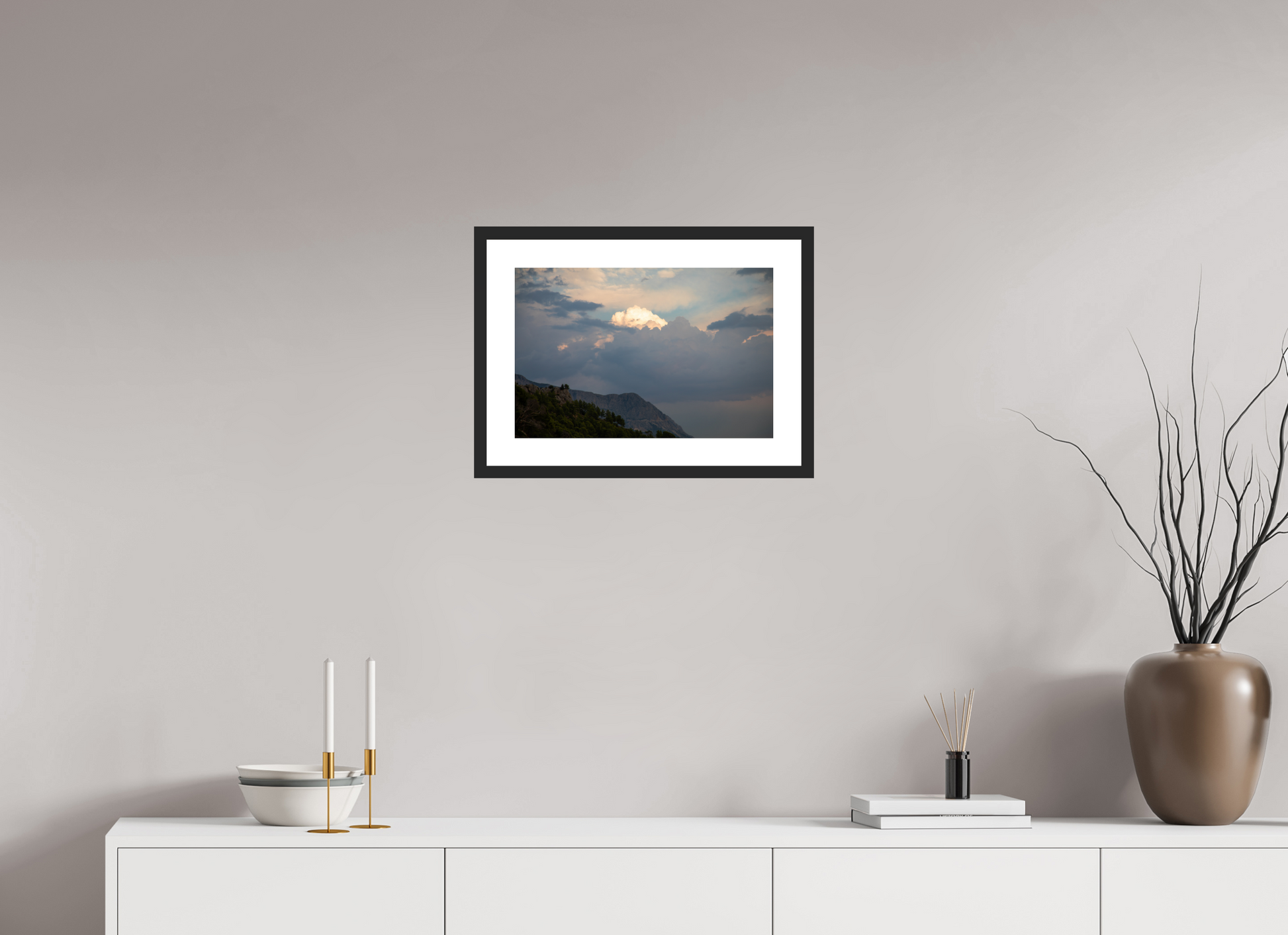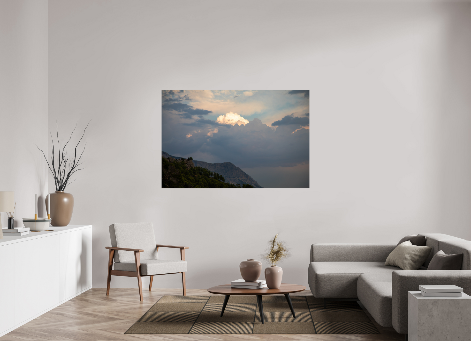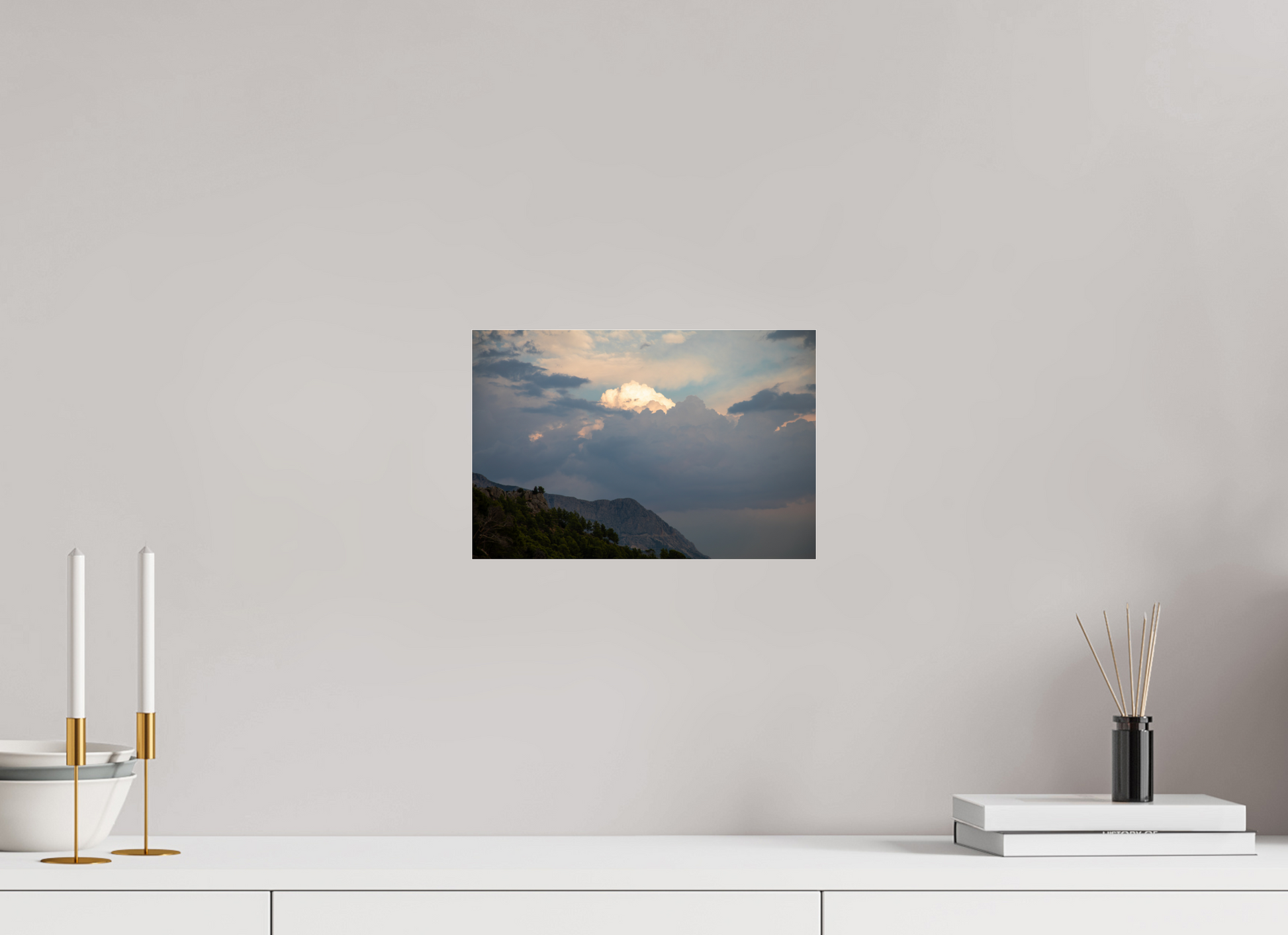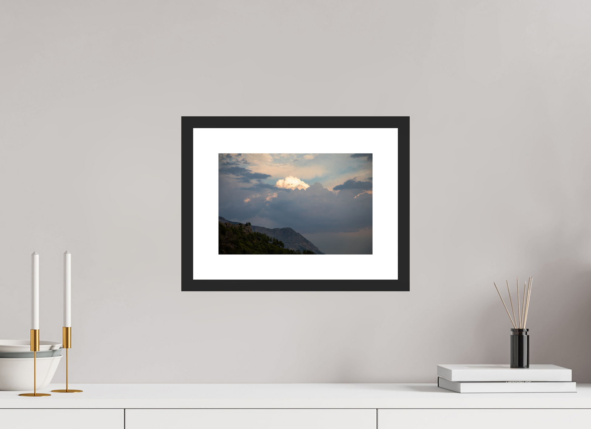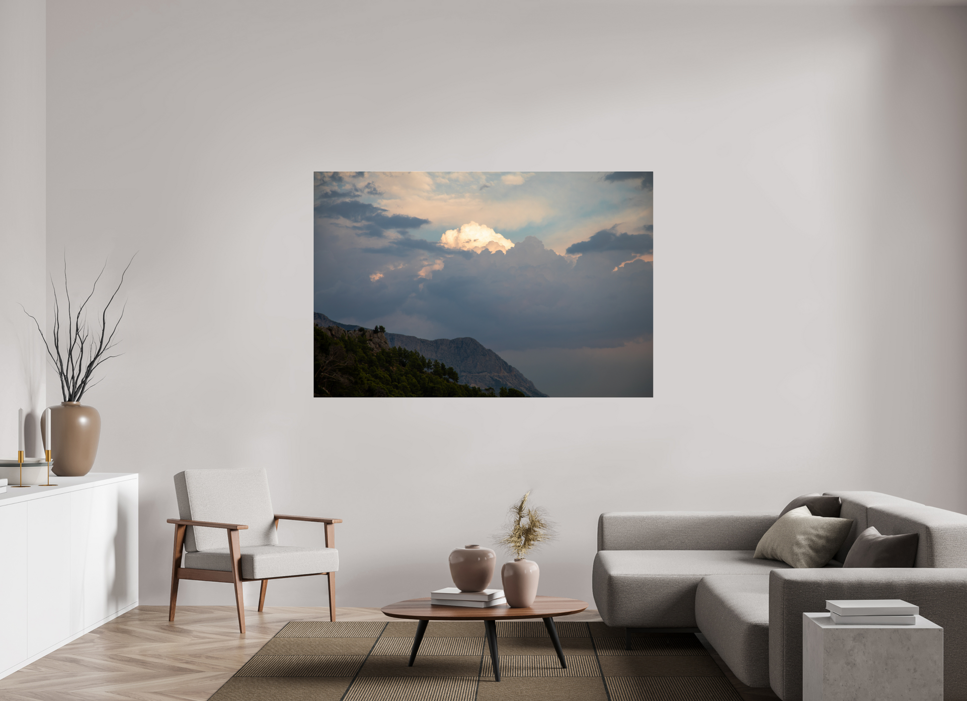 "Clouds" – ein Fine Art Print, der die ungezügelte Schönheit eines dramatischen Himmels festhält. Dunkle, tiefgraue Wolken türmen sich auf, ihre Masse und Dichte erzeugen ein Gefühl von Kraft und Urgewalt. Doch mitten in diesem Schauspiel der Natur bricht das Licht durch – ein strahlend helles Zentrum inmitten der dunklen Wolken, das an einen göttlichen Schein erinnert. Die Farben sind intensiv und kontrastreich: Tiefes Grau und Schwarz treffen auf strahlendes Weiß und zarte Pastelltöne am Rande der Lichtung. Die darunter liegende Berglandschaft, dunkel und geheimnisvoll, wirkt wie eine Bühne für dieses himmlische Spektakel. Ein Bild voller Dynamik und Spannung, das die Kraft und Schönheit der Natur in ihrer ganzen Pracht zeigt. Ein Kunstwerk, das die Fantasie anregt und die Betrachter in seinen Bann zieht.