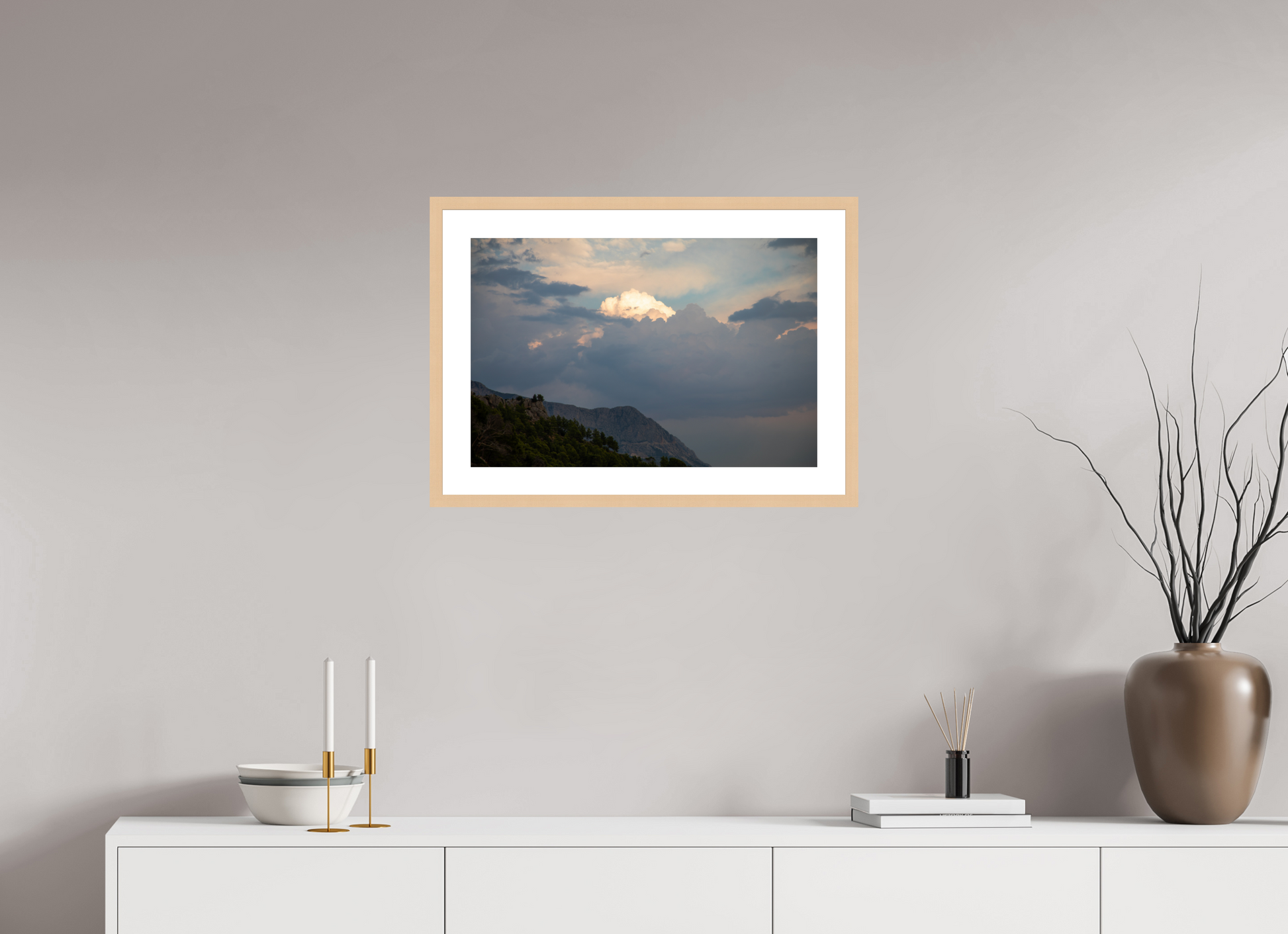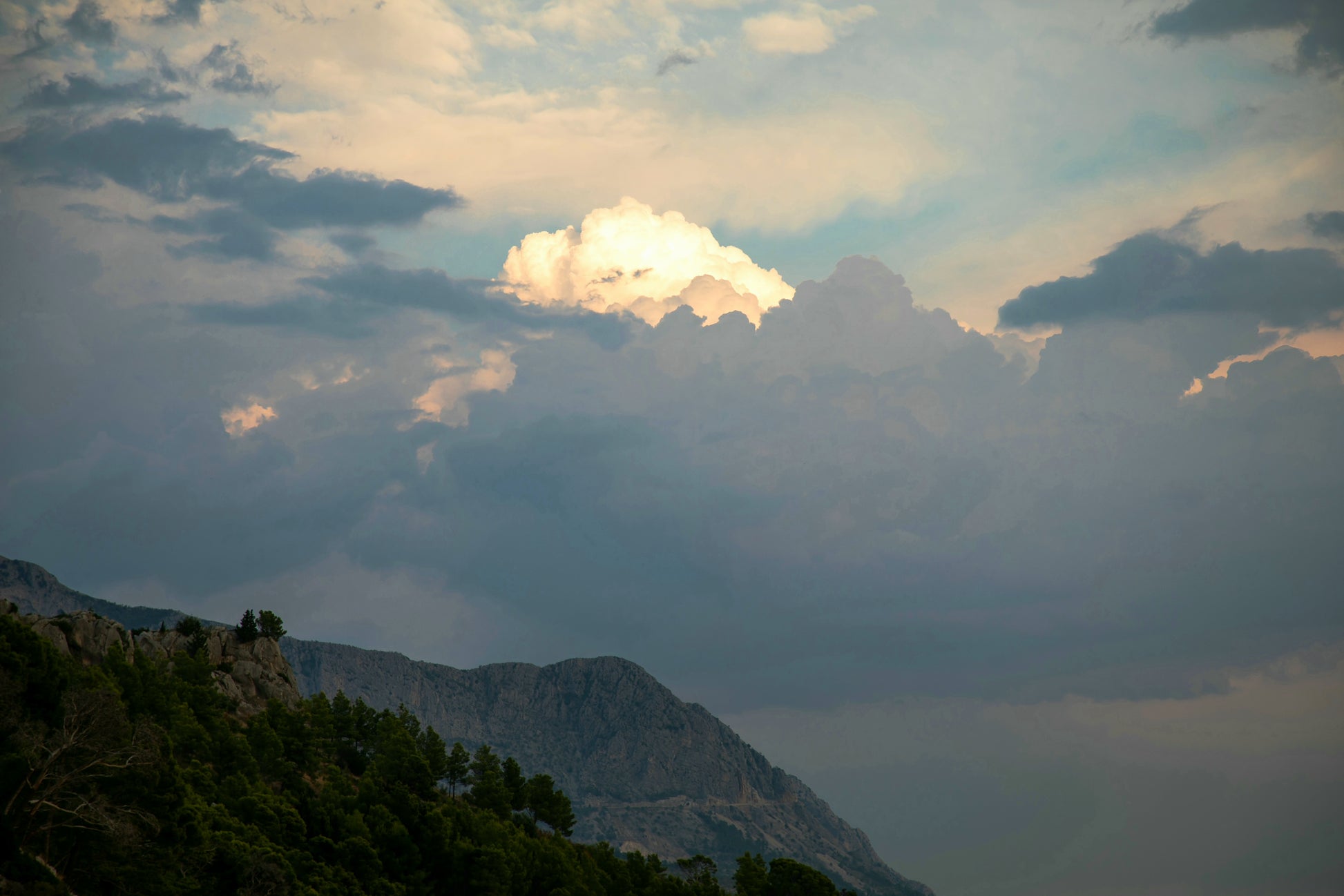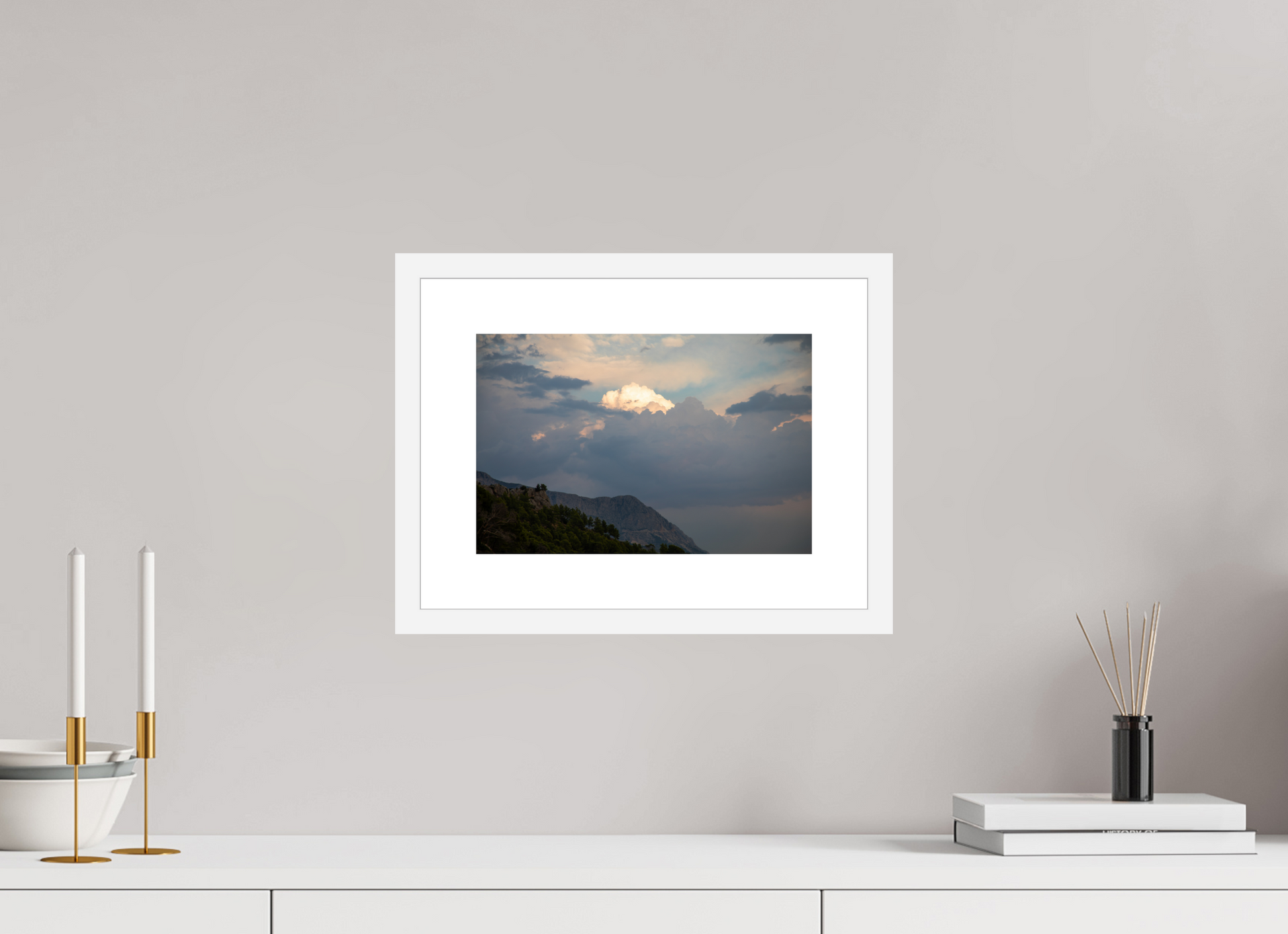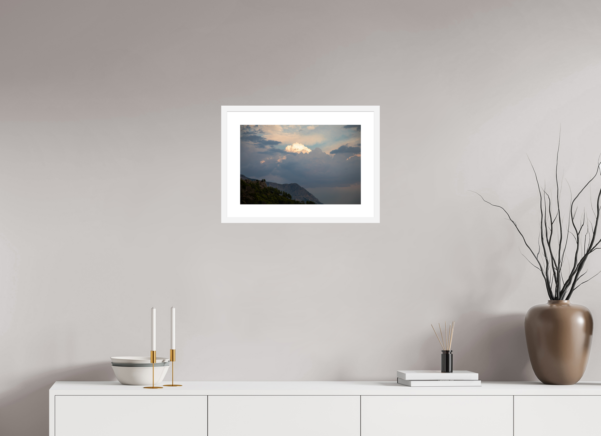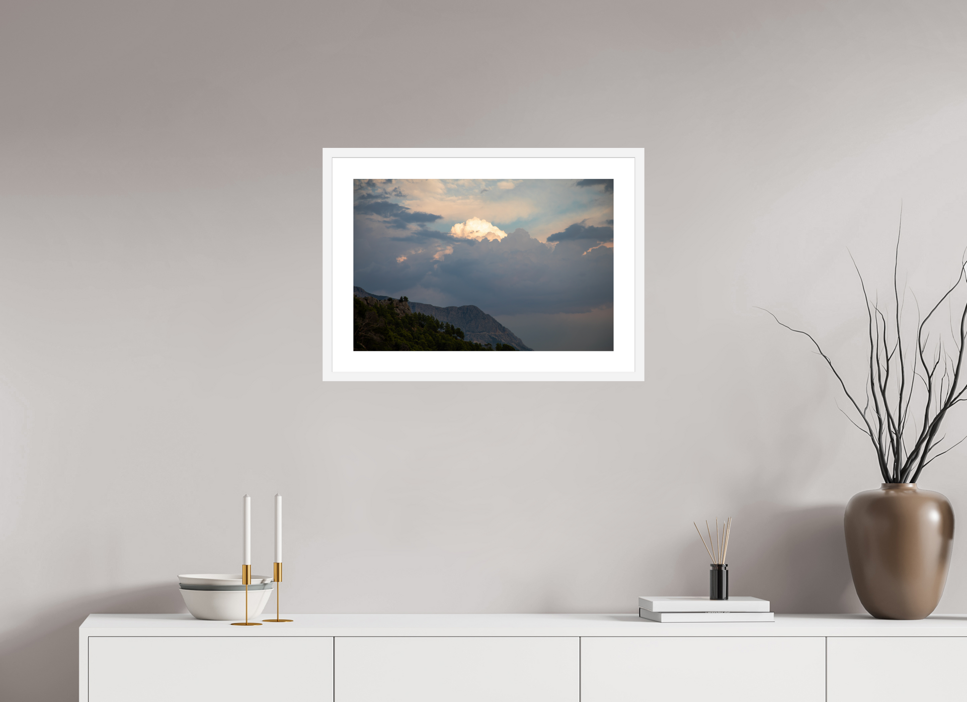 "Clouds" – ein Fine Art Print, der die ungezügelte Schönheit eines dramatischen Himmels festhält. Dunkle, tiefgraue Wolken türmen sich auf, ihre Masse und Dichte erzeugen ein Gefühl von Kraft und Urgewalt. Doch mitten in diesem Schauspiel der Natur bricht das Licht durch – ein strahlend helles Zentrum inmitten der dunklen Wolken, das an einen göttlichen Schein erinnert. Die Farben sind intensiv und kontrastreich: Tiefes Grau und Schwarz treffen auf strahlendes Weiß und zarte Pastelltöne am Rande der Lichtung. Die darunter liegende Berglandschaft, dunkel und geheimnisvoll, wirkt wie eine Bühne für dieses himmlische Spektakel. Ein Bild voller Dynamik und Spannung, das die Kraft und Schönheit der Natur in ihrer ganzen Pracht zeigt. Ein Kunstwerk, das die Fantasie anregt und die Betrachter in seinen Bann zieht.