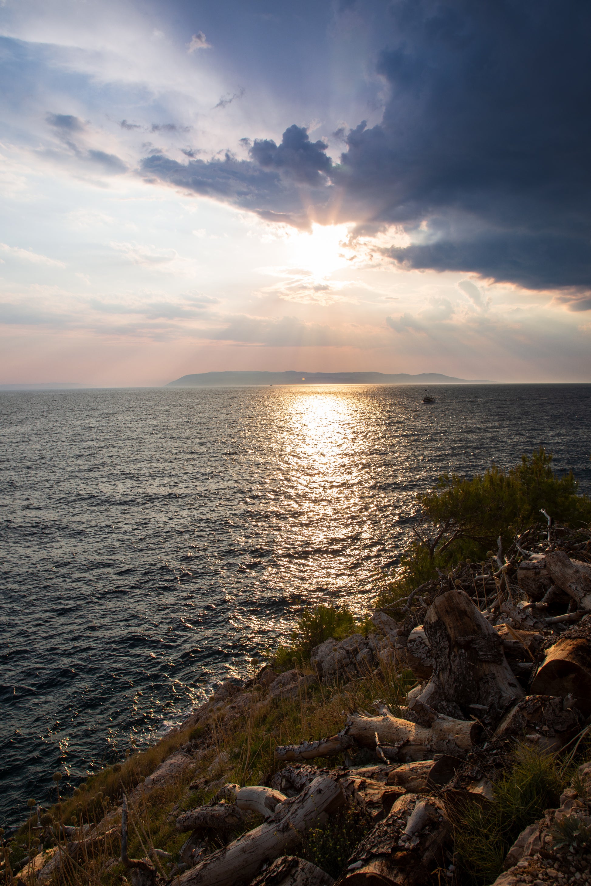 Eine detailreiche Aufnahme einer Küstenlandschaft bei Sonnenuntergang. Die warmen Farben des Himmels spiegeln sich im ruhigen Meer wider. Verwitterte Baumstämme im Vordergrund bilden einen starken Kontrast zur Weite des Horizonts und der dramatischen Wolken. Ein Bild, das die Schönheit der Natur in ihrer Ursprünglichkeit zeigt.