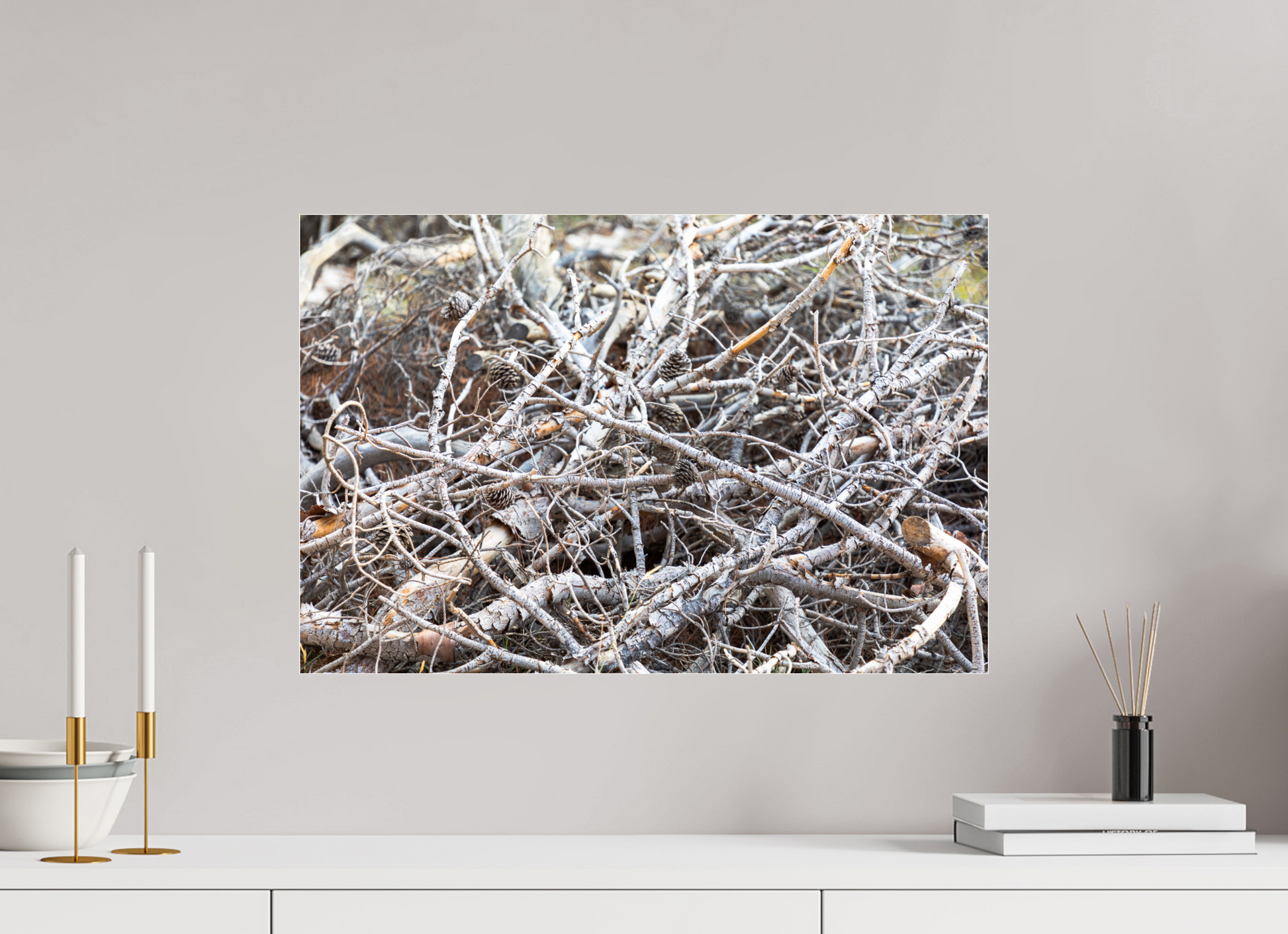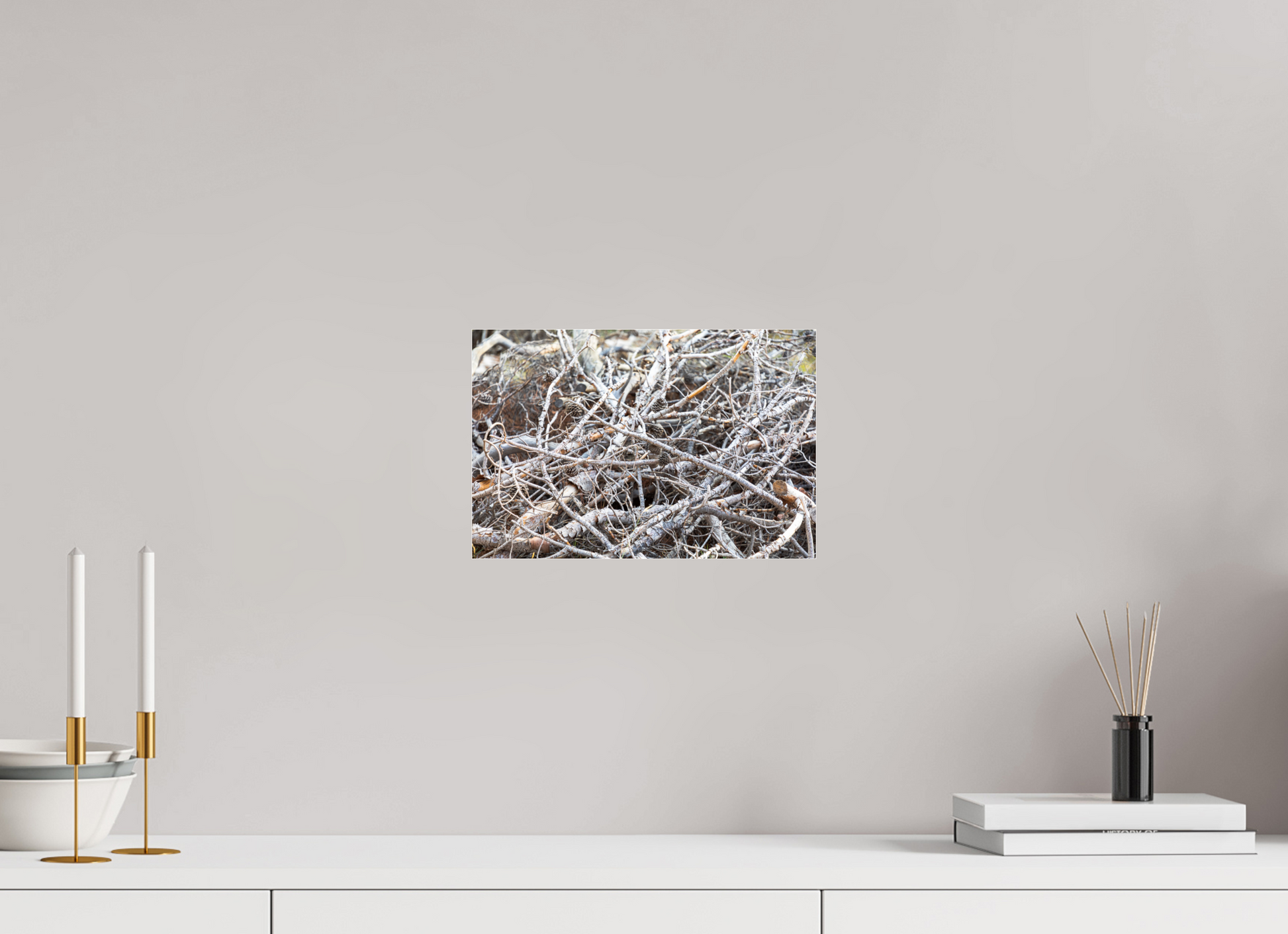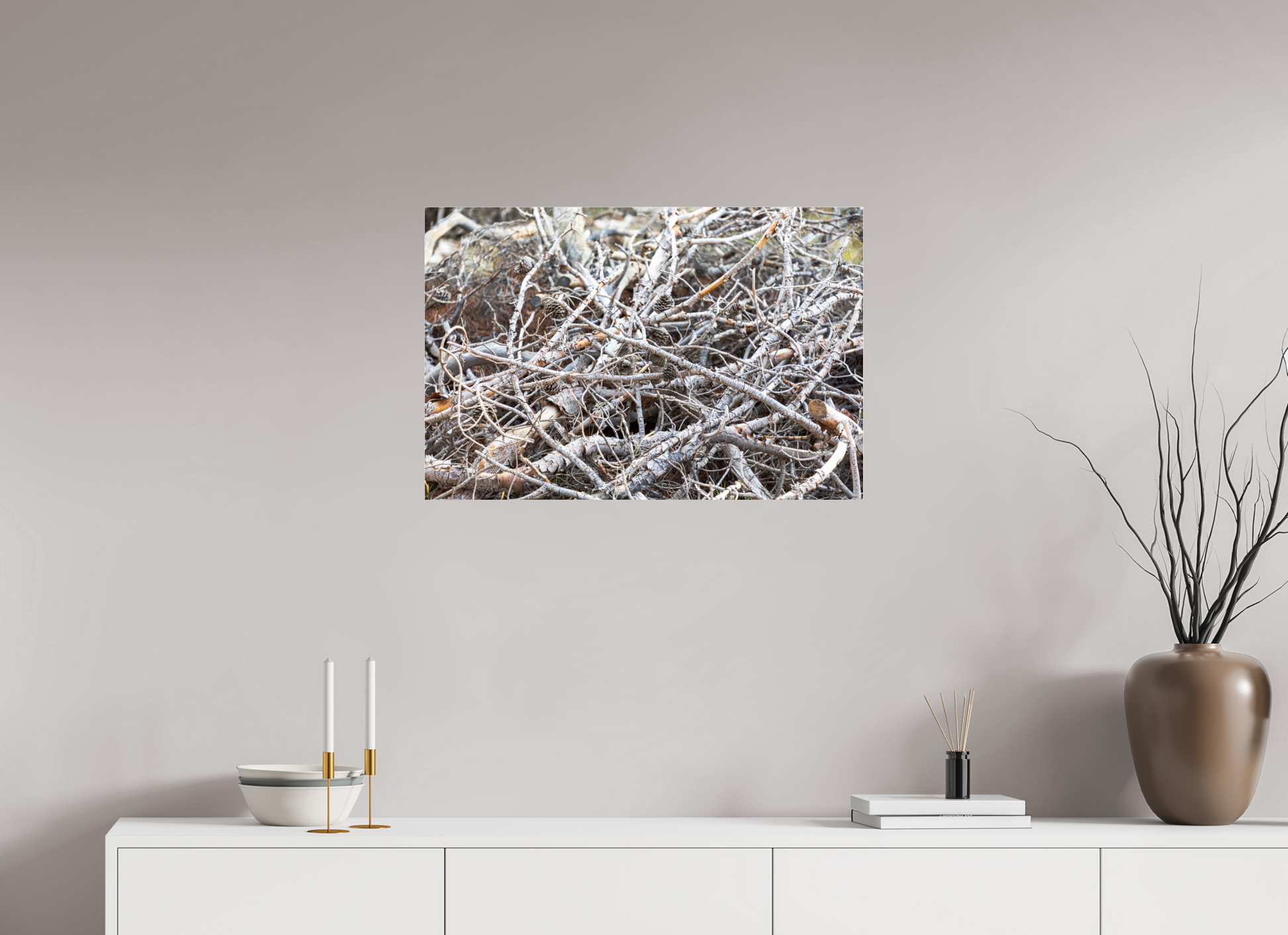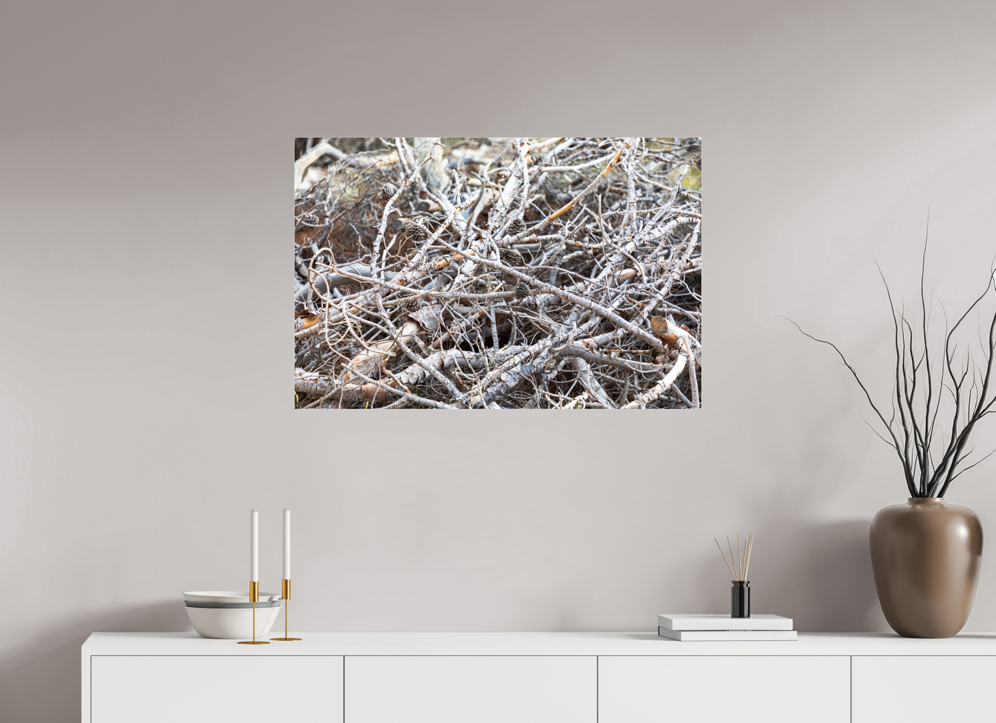 Dieses Fine Art Print zeigt eine Nahaufnahme von Ästen und Zweigen. Die Äste sind in verschiedenen Größen und Formen verstreut und bilden ein komplexes, fast abstraktes Muster. Die Textur des Holzes, die Rinde und die kleinen Zapfen sind detailliert sichtbar. Die monochromen Farben, die hauptsächlich aus verschiedenen Grautönen und Brauntönen bestehen, verstärken die natürliche Schönheit und die Textur des Motivs. Das Bild ist sowohl ästhetisch ansprechend als auch ein faszinierendes Beispiel für die Schönheit der Natur in ihrer rohen Form. Es eignet sich perfekt als Dekorationselement für moderne und minimalistische Innenräume, aber auch für Räume mit einem rustikalen oder naturverbundenen Stil.