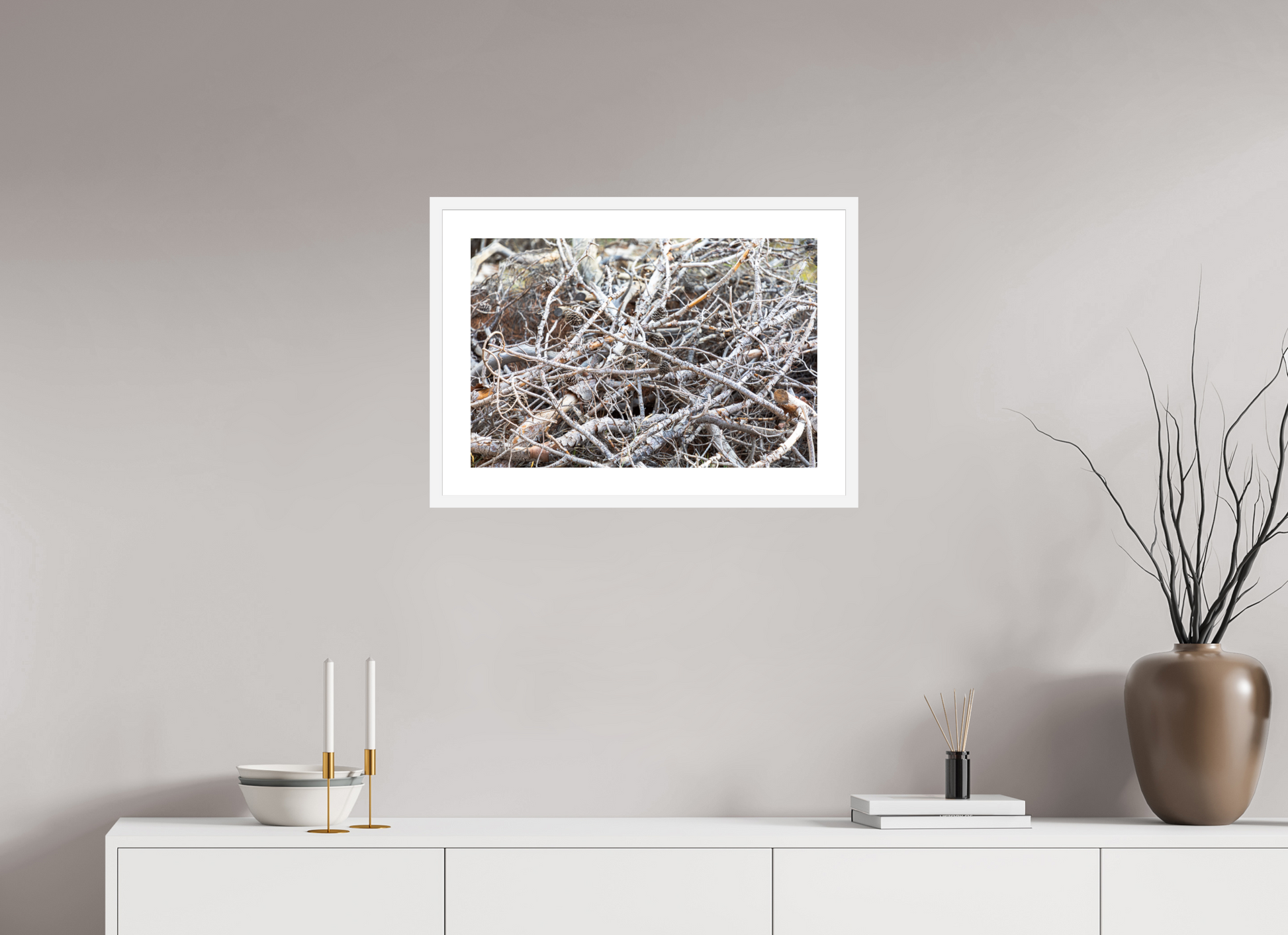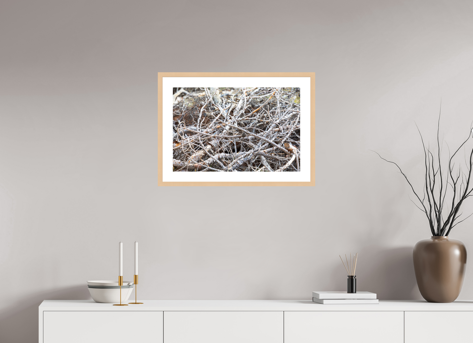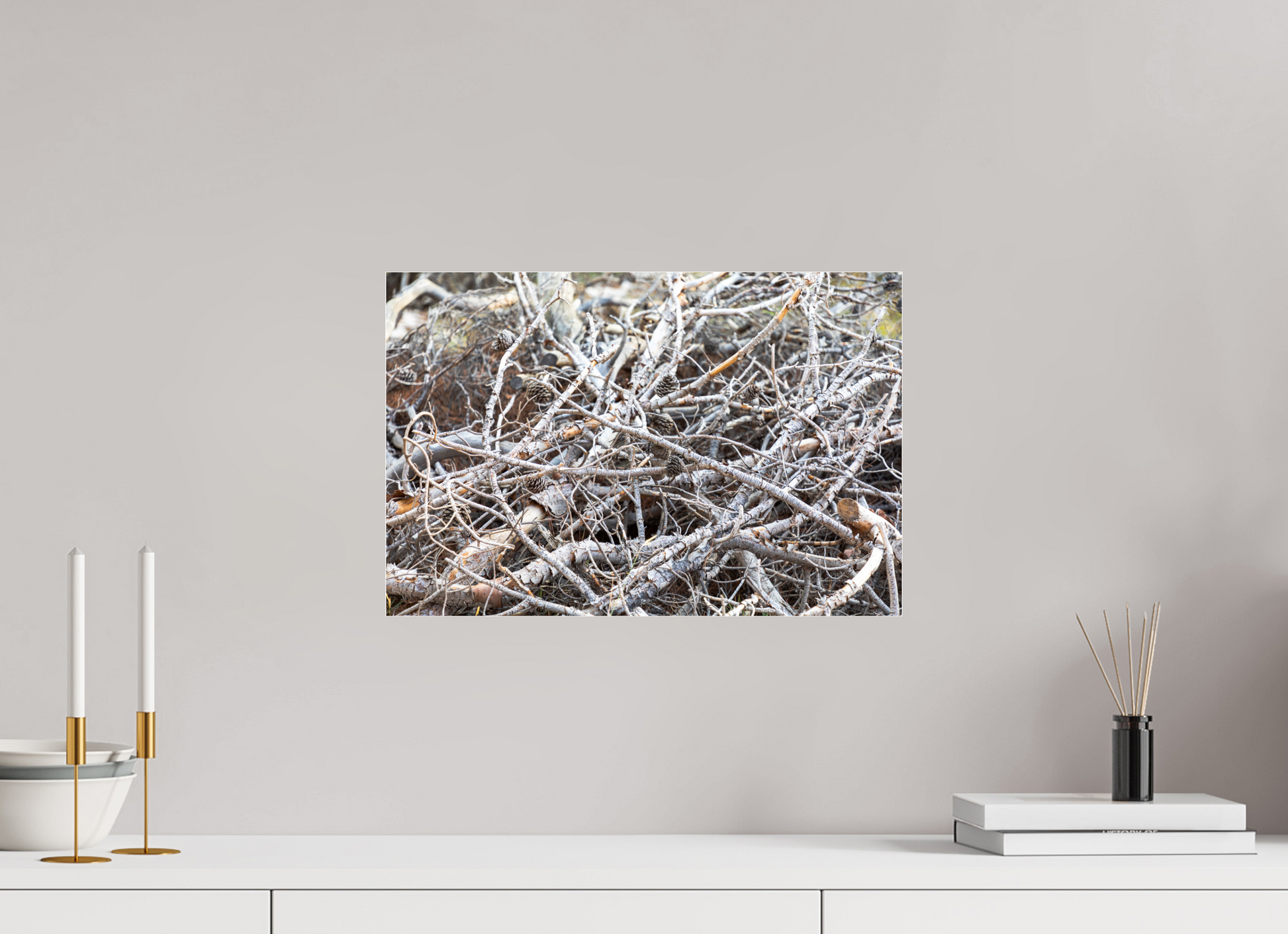 Dieses Fine Art Print zeigt eine Nahaufnahme von Ästen und Zweigen. Die Äste sind in verschiedenen Größen und Formen verstreut und bilden ein komplexes, fast abstraktes Muster. Die Textur des Holzes, die Rinde und die kleinen Zapfen sind detailliert sichtbar. Die monochromen Farben, die hauptsächlich aus verschiedenen Grautönen und Brauntönen bestehen, verstärken die natürliche Schönheit und die Textur des Motivs. Das Bild ist sowohl ästhetisch ansprechend als auch ein faszinierendes Beispiel für die Schönheit der Natur in ihrer rohen Form. Es eignet sich perfekt als Dekorationselement für moderne und minimalistische Innenräume, aber auch für Räume mit einem rustikalen oder naturverbundenen Stil.