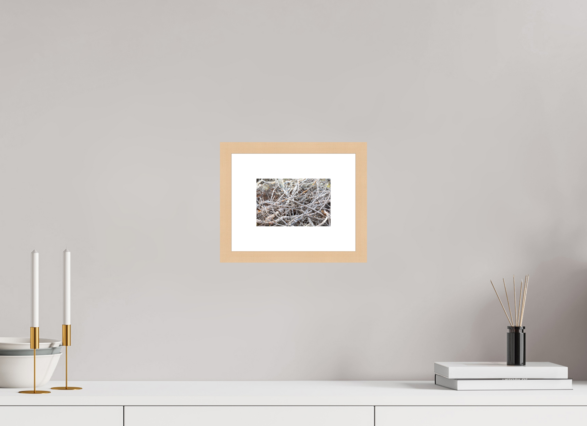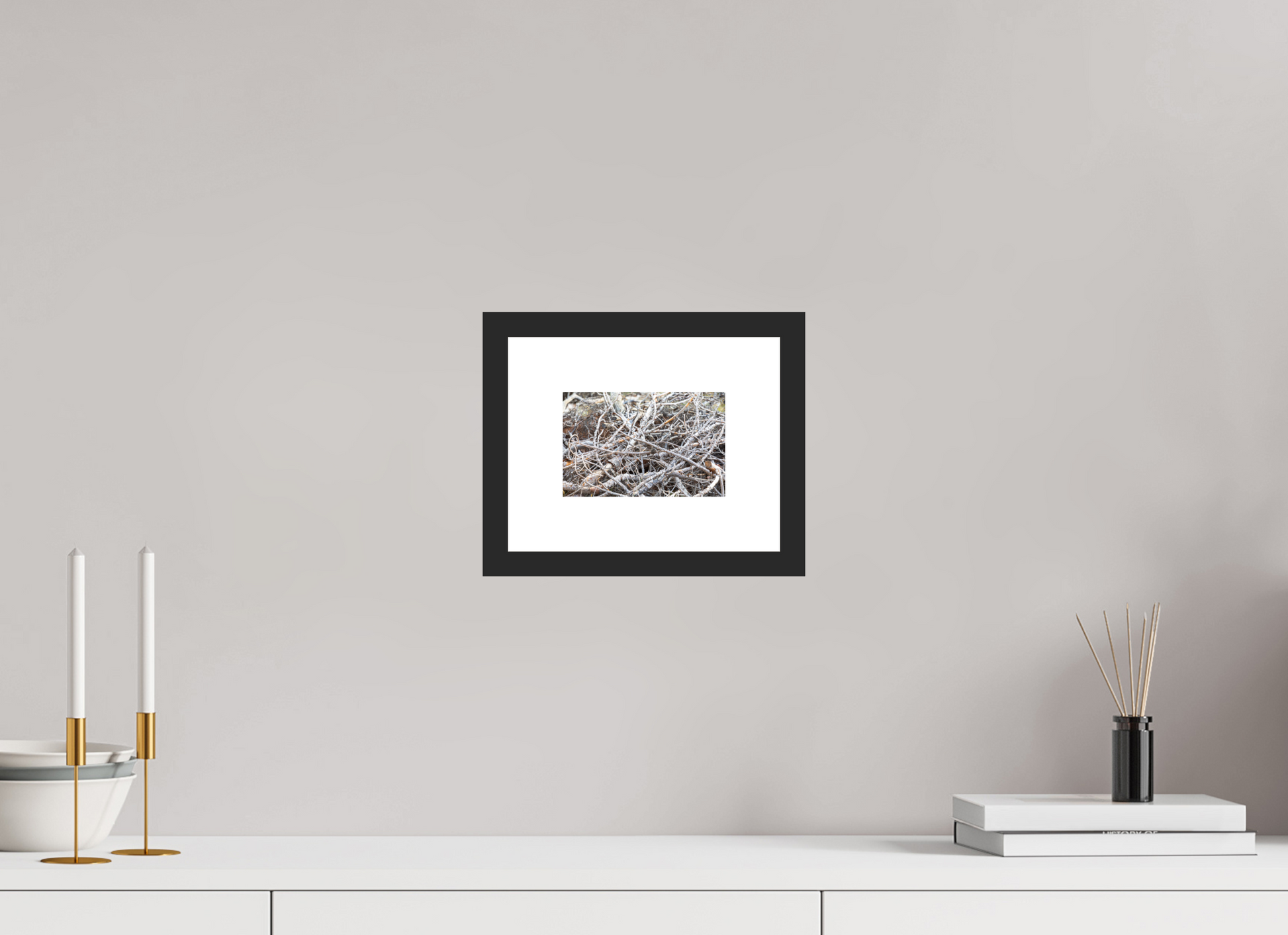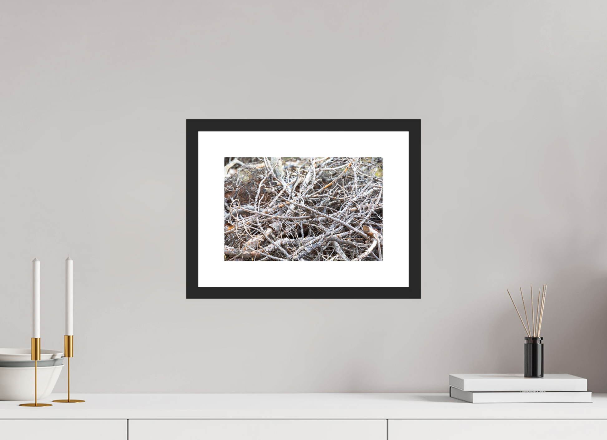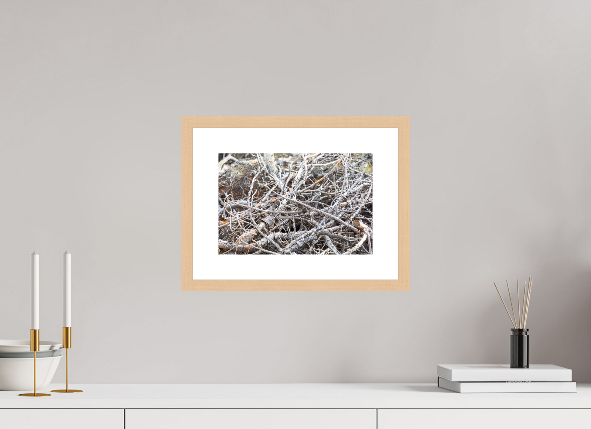 Dieses Fine Art Print zeigt eine Nahaufnahme von Ästen und Zweigen. Die Äste sind in verschiedenen Größen und Formen verstreut und bilden ein komplexes, fast abstraktes Muster. Die Textur des Holzes, die Rinde und die kleinen Zapfen sind detailliert sichtbar. Die monochromen Farben, die hauptsächlich aus verschiedenen Grautönen und Brauntönen bestehen, verstärken die natürliche Schönheit und die Textur des Motivs. Das Bild ist sowohl ästhetisch ansprechend als auch ein faszinierendes Beispiel für die Schönheit der Natur in ihrer rohen Form. Es eignet sich perfekt als Dekorationselement für moderne und minimalistische Innenräume, aber auch für Räume mit einem rustikalen oder naturverbundenen Stil.